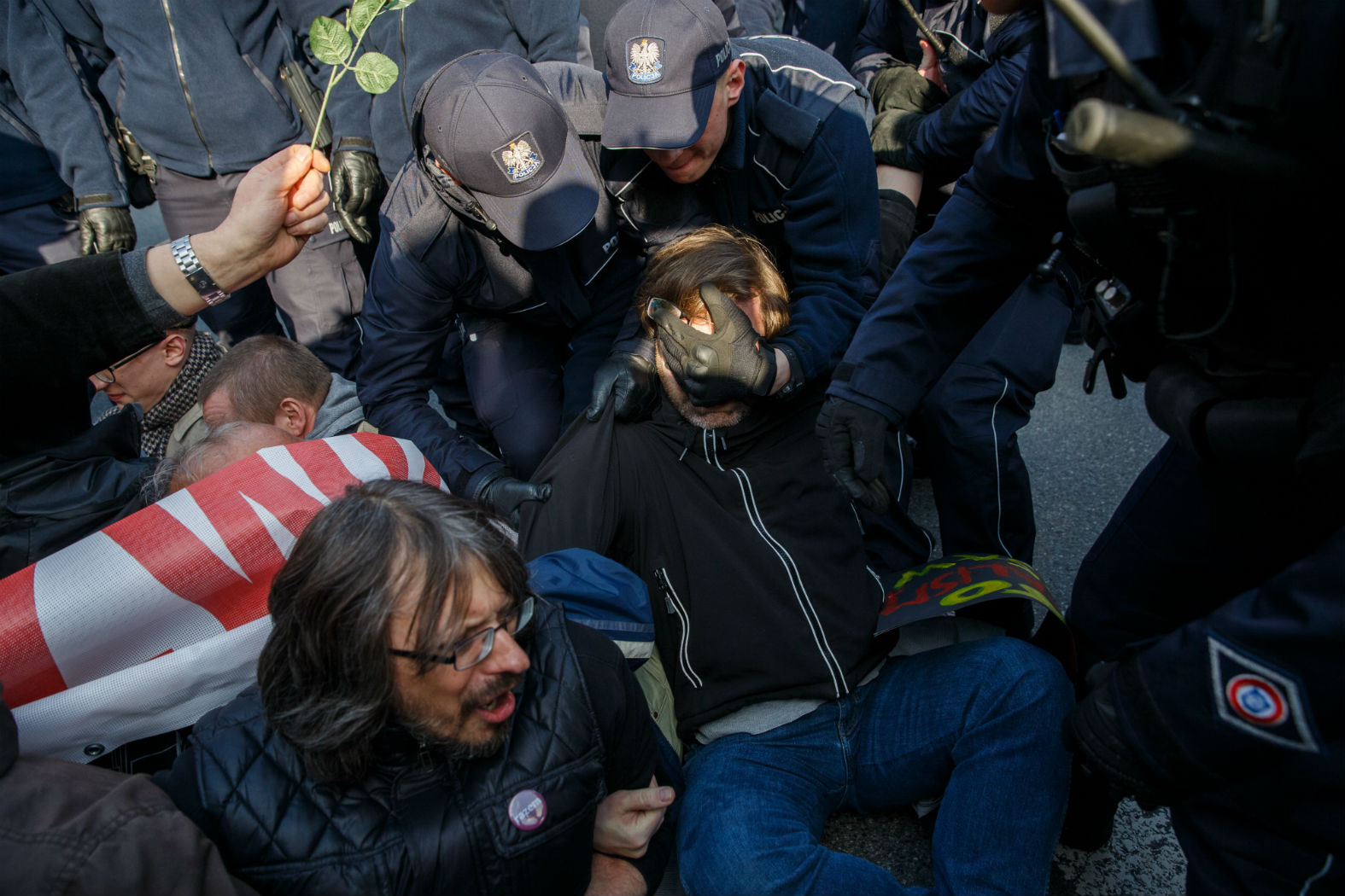 Próbują wyrwać nam baner, ale nie pozwalamy im na to. Ten sitting trwa kilkanaście minut. Siedzący wznoszą stosowne hasła, policjanci czekają na rozkazy. Chyba w końcu rozkaz pada, bo nadbiega nowa grupa funkcjonariuszy i po kolei wynoszą siedzących z ulicy. Są dobrze wytrenowani. Chwytają ofiarę w kilku i nie ma zmiłuj. Komuś łamią okulary, innego siedzącego brutalnie ściskają za głowę i uszkadzają mu nos. Mnie niesie czterech i w miarę delikatnie. W docelowym punkcie nie rzucają mną o trotuar, ale po prostu kładą na chodnik. Okulary całe, nos też.