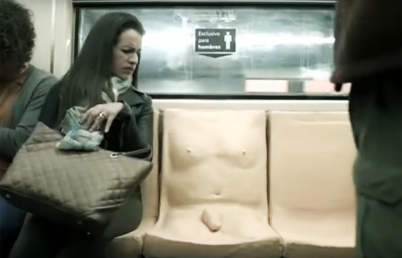 Nad krzesełkiem umieszczono dodatkowe oznaczenie – „tylko dla mężczyzn”. Na podłodze zaś informację tłumaczącą nietypowy kształt siedzenia: „To irytujące podróżować w ten sposób, ale to nic w porównaniu do przemocy seksualnej, której doświadczają kobiety każdego dnia”.