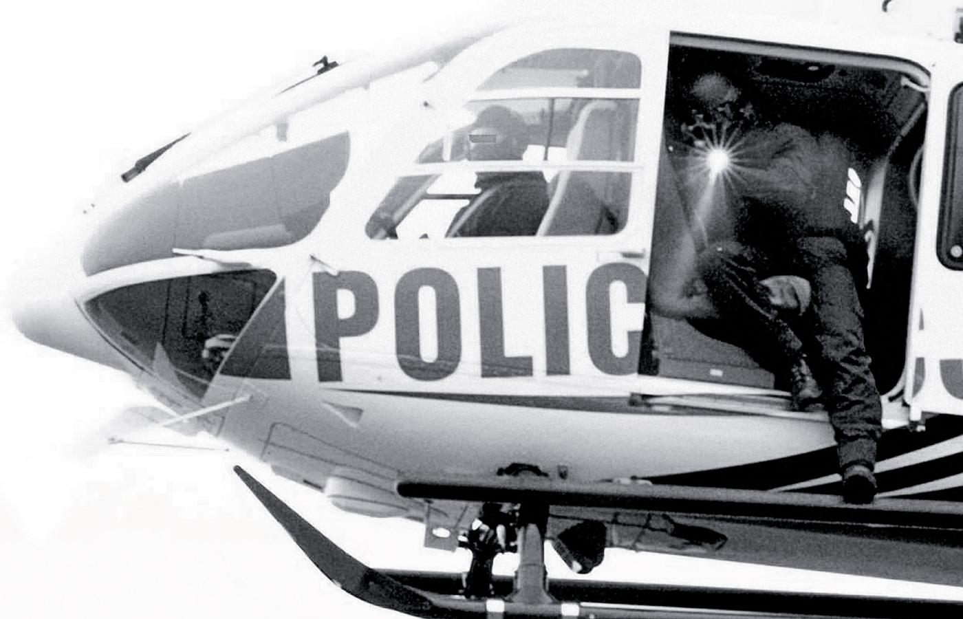 Obiektyw uchwycił zbliżający się helikopter z kilkoma byłymi żołnierzami GROM. Jeden z nich miał amerykański karabin samopowtarzalny POF. Z tej broni powinien wymierzyć w kamerę i zamarkować strzał. Według ustaleń z operatorem helikopter powinien znajdować się w odległości co najmniej 50 m od kosza podnośnika. Zbliżenie się bliżej byłoby niebezpieczne dla Aleksowskiego i jego asystenta, bo wiatr wytwarzany przez śmigło mógł ich najzwyczajniej w świecie zdmuchnąć.