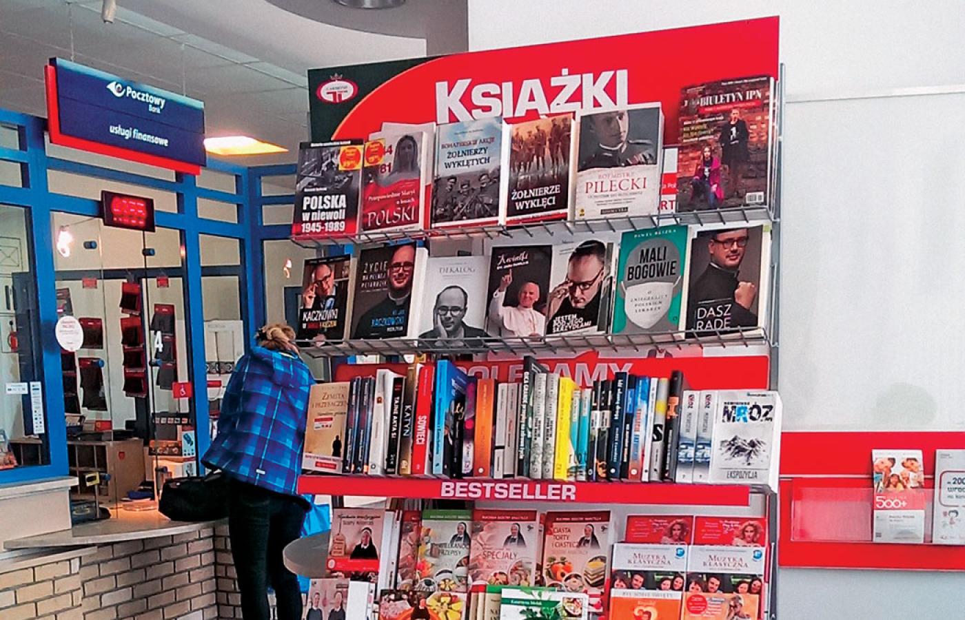 Żołnierze wyklęci – bohaterskie akcje. Pełne dwie górne półki. Życiorysy świętych, w szczególności kanonizowanych nie tak dawno Jana Pawła II i Matki Teresy, półka kolejna. Dalej wspomnienia księdza Jana Kaczkowskiego – kilka wydań; „Resortowe dzieci” w mediach i polityce, „Porozumienie przeciw monowładzy” Jarosława Kaczyńskiego i rozprawa z Lechem Wałęsą „Za, a nawet przeciw” prawicowego publicysty Piotra Semki oraz seria Wojciecha Cejrowskiego. Biuletyny Instytutu Pamięci Narodowej, a także kilka półek poradników kulinarnych (na okładkach same zakonnice). Ponadto „Katalogi aniołów”, „Biblia dla dzieci”, „Posłaniec serca Jezusowego”, „Wszystko o Matce Bożej” oraz – dla melomanów – „Oratorium dla prześladowanych za wiarę” Piotra Rubika, z adnotacją: do kupienia wyłącznie w sieci Poczta Polska. Książki sąsiadują, przypadkiem lub celowo, z modlitewnikiem do medytacji „W intencji Ojczyzny”. Jest i literatura – by tak rzec – piękna. „Gorzka pomarańcza” Nadii Hamid, czyli „prawdziwa historia Polki, która poślubiła Libijczyka” (historia nie ma, rzecz jasna, szczęśliwego zakończenia), oraz tym podobne. Obok książek i prasy (wyeksponowana ta „patriotyczna”) – biało-czerwone szaliki.