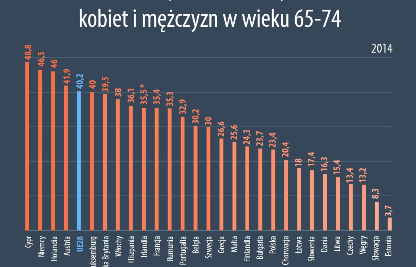 W 2014 r. przeciętna Europejka pobierała o 39 proc. niższą emeryturę niż przeciętny Europejczyk, choć między krajami są spore różnice: najniższa luka jest w Estonii (zaledwie 3,7 proc.), najwyższa zaś na Cyprze (48 proc.). W Polsce zgodnie z danymi GUS przeciętna emerytura kobiety jest o ok. 500 zł niższa niż świadczenie mężczyzny. Zajmujemy dziesiąte miejsce z luką emerytalną wynoszącą 23,4 proc. Na tle średniej europejskiej nie jest aż tak źle, choć obniżenie wieku emerytalnego od października tego roku być może pogłębi różnice między świadczeniami.