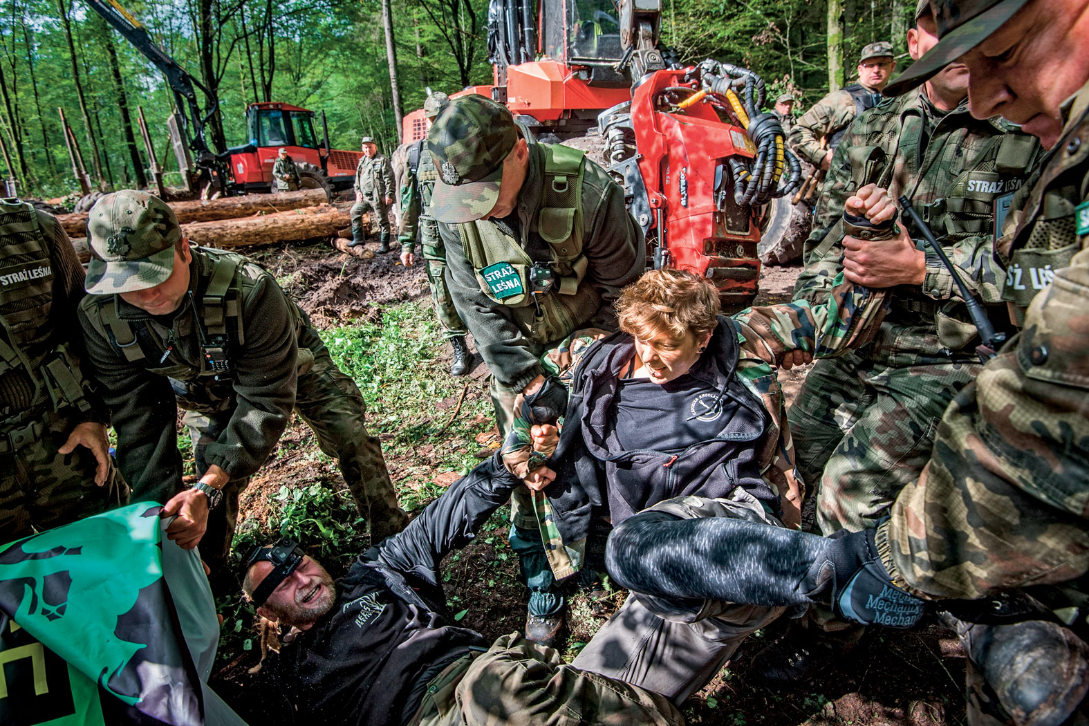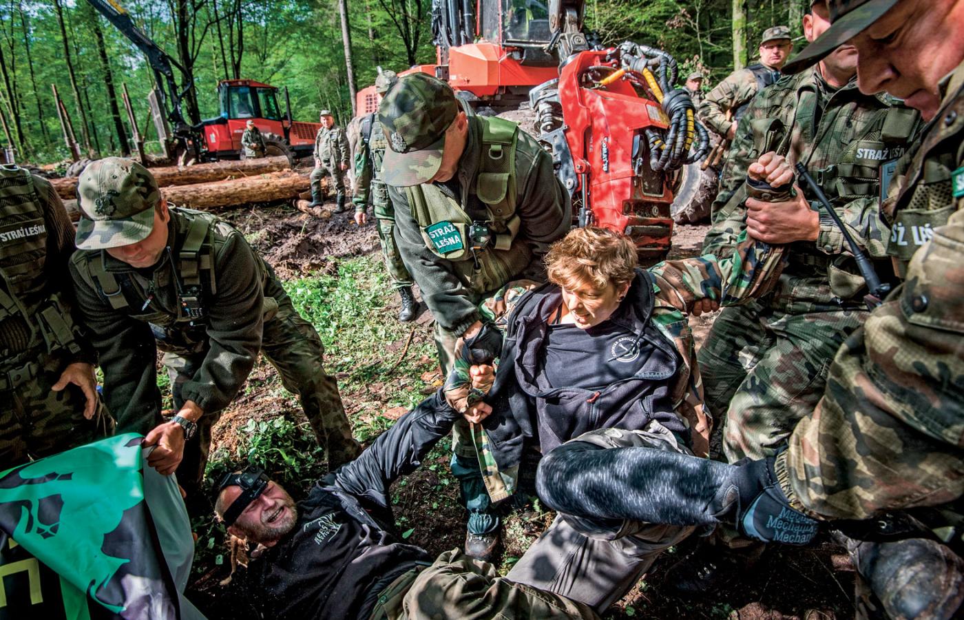 Z protestującymi strażnicy nie prowadzą negocjacji. Schodzisz czy nie, krzyczą do wiszącego na forwarderze ekologa. Jak nie, to podjeżdża drugi ciągnik i na daszek kabiny o powierzchni mniej więcej półtora metra na metr wychodzi czterech strażników i ściągają protestującego za co się da, za ubranie, za nogę. W każdej chwili oni albo podwieszony ekolog mogą zlecieć. Potem z dachu forwardera spychają go na silnik, na koło i na ziemię. – Tak mnie ściągali 29 sierpnia, mam półtorej strony obdukcji lekarskiej, tyle siniaków mi nabili – mówi Michał Książek. – A ubrania już wszystkie podarte.