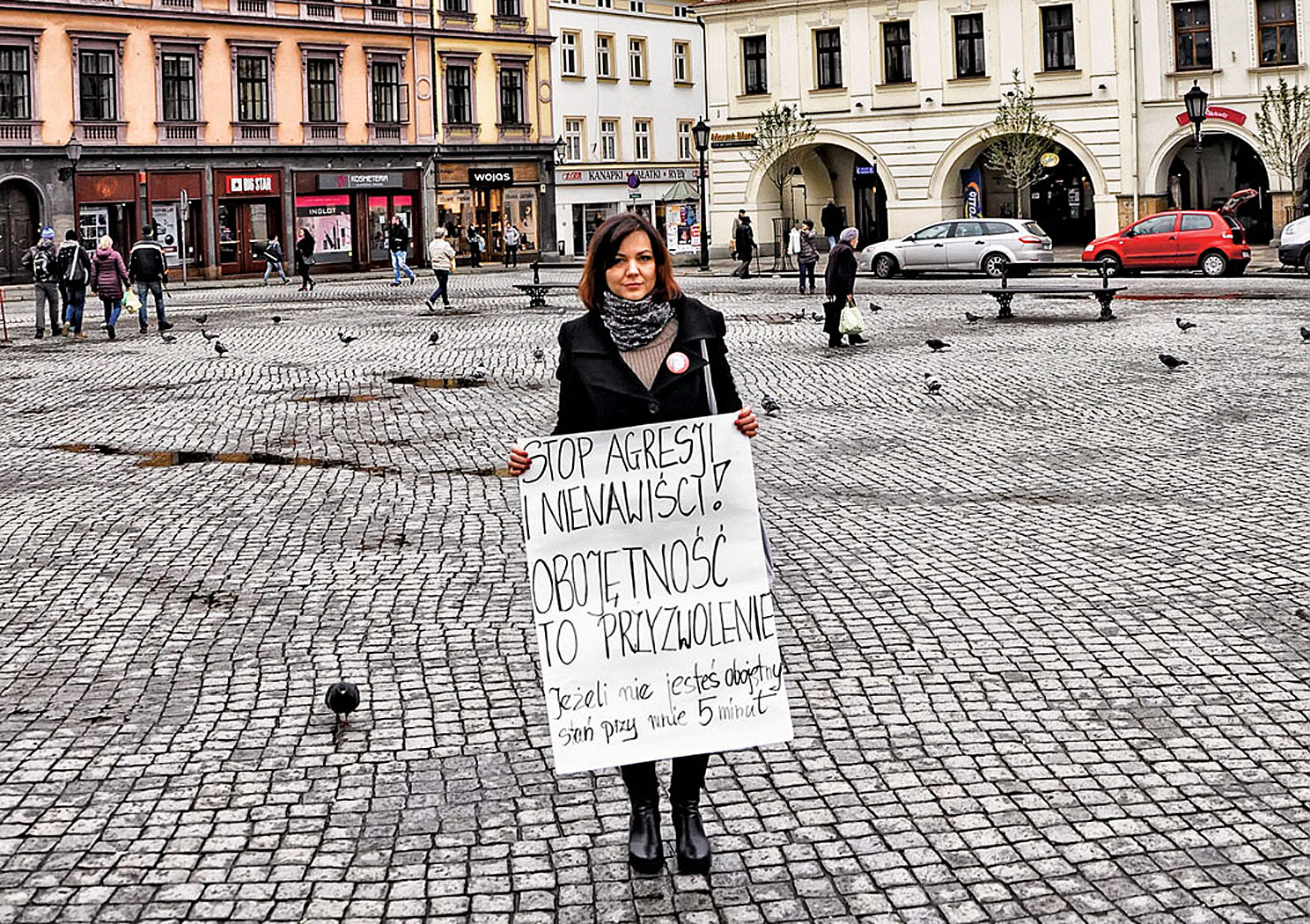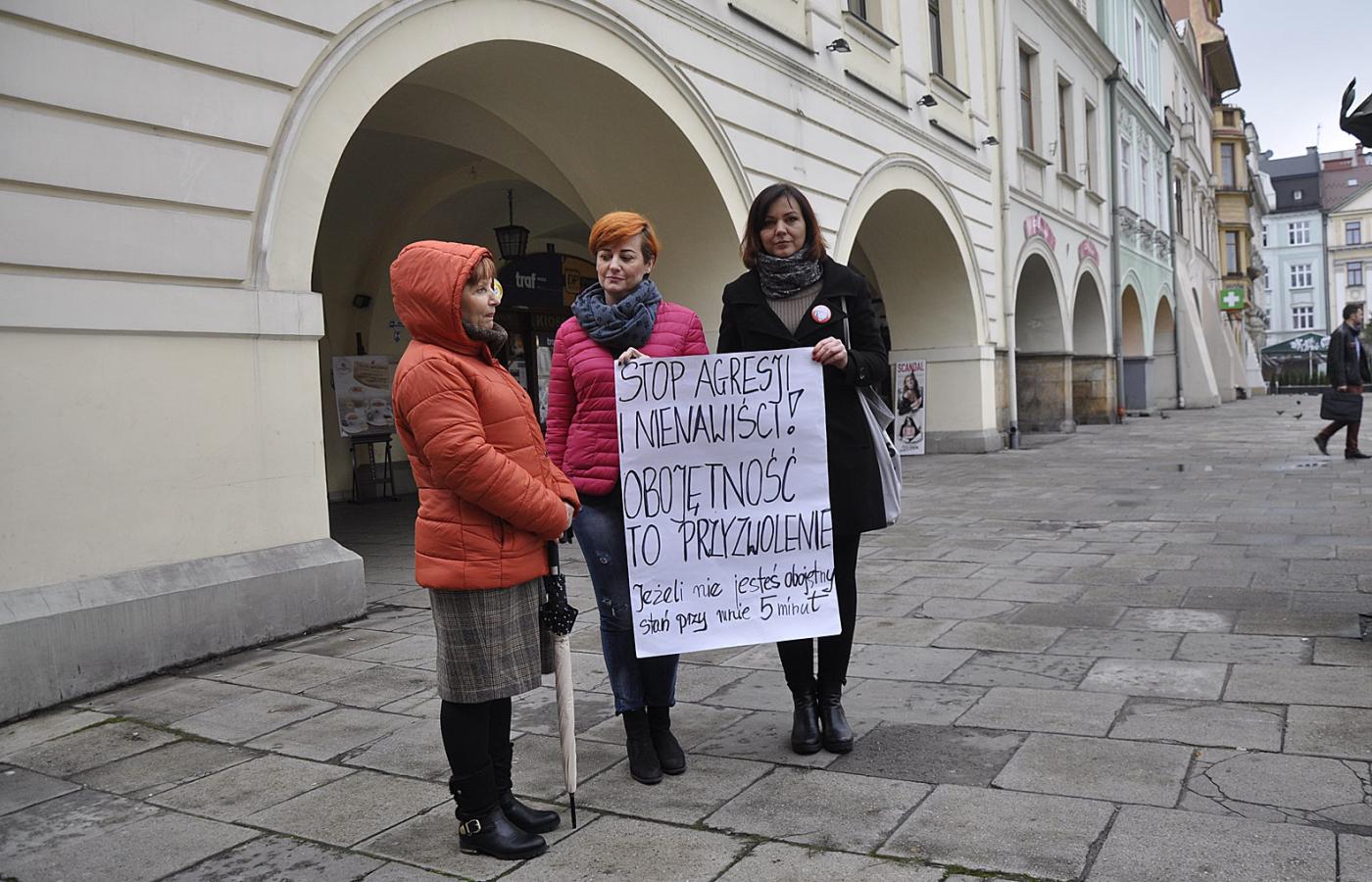 Czasami ktoś przejdzie obok i tylko parsknie śmiechem, przewróci oczami w odruchu lekceważenia. Albo najwyżej gdzieś z oddali uniesie kciuk do góry, tak jakby bał się podejść nawet o krok bliżej. Zwykle jednak mało kto w Cieszynie zwraca uwagę na Gabrysię, stojącą i czytającą na głos manifest Piotra S. na rynku. Miesiąc temu, gdy zaczynała, była zupełnie sama. Teraz jest różnie – czasem towarzyszą jej dwie, czasem cztery osoby. Myślała, że będzie inaczej, liczniej, że ludzi to poruszy. Jak w Warszawie, do której jeździ na protesty Obywateli RP i wtedy zawsze czuje, że jest w silnej grupie.