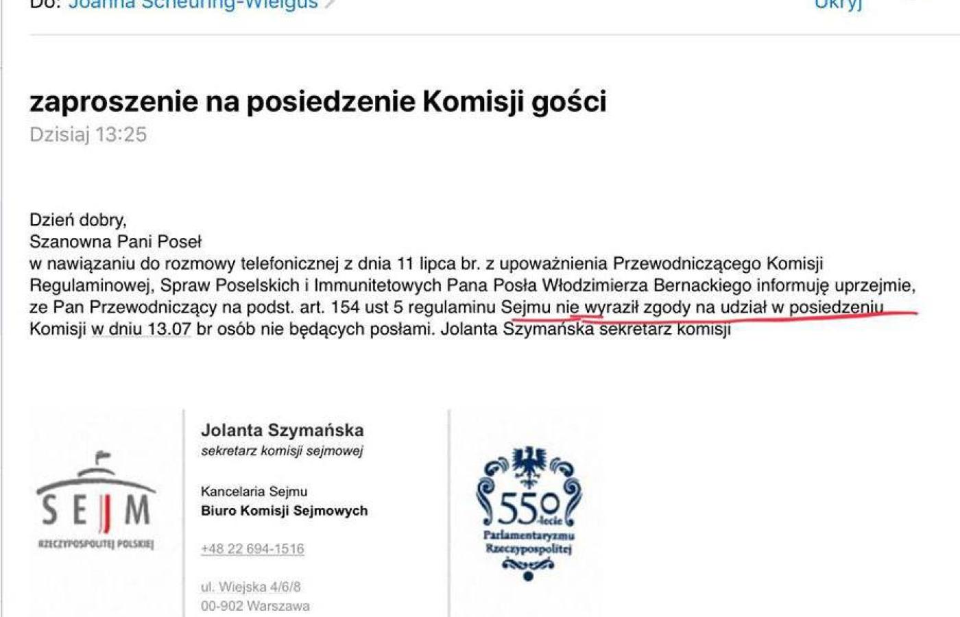 12 lipca otrzymała jednak odmowę. W przesłanym posłance wczoraj piśmie z upoważnienia przewodniczącego komisji regulaminowej Włodzimierza Bernackiego jej sekretarz Jolanta Szymańska napisała, że na podstawie „art.