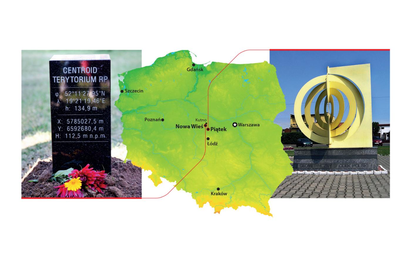 Pomnik z napisem „Geometryczny środek Polski” jest dla mieszkańców Piątku niczym Wawel dla krakusów. Umieszczony na placu w rynku, otoczony kołem biało-czerwonych kwiatów, rozsławia wioskę w woj. łódzkim od czasów głębokiego PRL. Od 13 października 2018 r. Piątek ma konkurenta w odległej o kilkanaście kilometrów Nowej Wsi pod Kutnem, gdzie geodeci, związani z nieformalną grupą Honorowy Południk Krakowski, dokonali „geodezyjnej dobrej zmiany”. Na prywatnej działce małżeństwa Ilony Piaseckiej i Michała Stokwiszewskiego wkopali granitowy cokół z napisem „Geodezyjne Serce Polski – centroid terytorium RP, wyznaczony z okazji 100-lecia Polski Niepodległej oraz Roku Polskiej Geografii”.