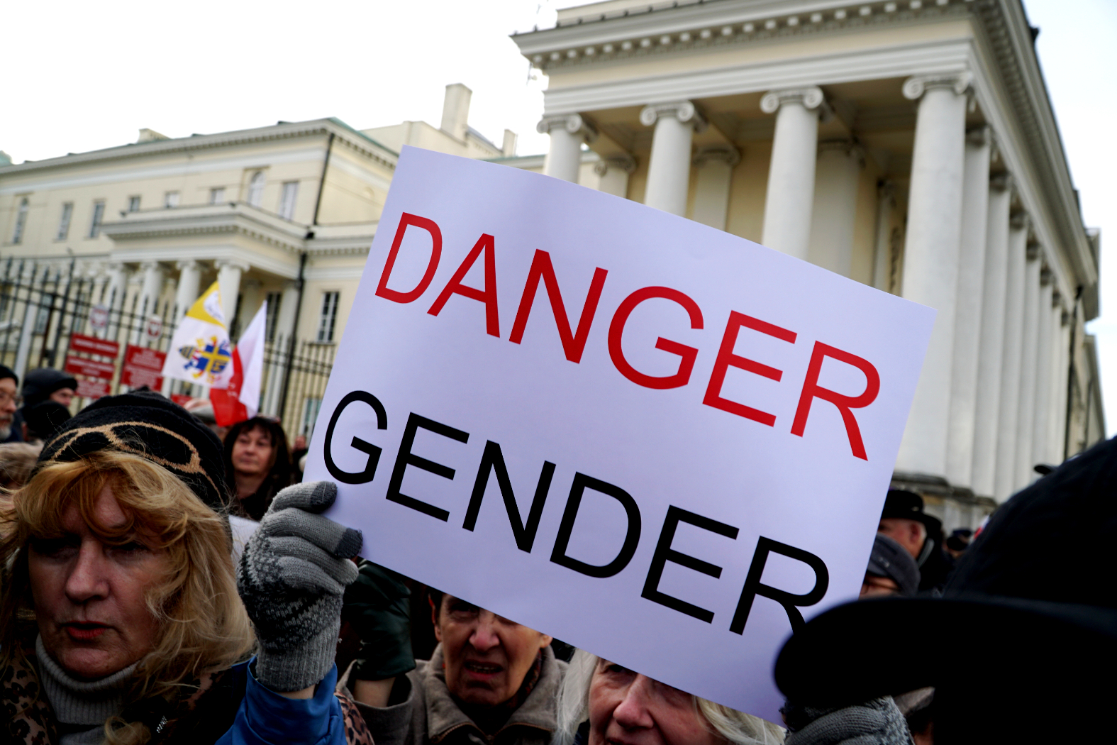 Aby zorientować się w nastrojach prawicowej manifestacji, czytam, co jest na transparentach. Uwagę przykuwa duża plansza, widać fragment obrazu Marii z Jezusem, obie postaci wpisano w różaniec układający się w kształt obrysu Polski. A pod spodem... trupia czaszka. Czy owo zestawienie wyjaśnia tekst na transparencie? Oto on: „Ideologia »płcie kulturowe«, czyli gender, to gnojówkowy, psychiczno-etyczny narkotyk – dopalacz. Zabija: tożsamość, duszę i ciało. Dziewczęta i chłopcy, rodzice, nauczyciele i wychowawcy, nie dajcie się otumanić LGBTQ-owymi kolorkami. Używajcie rozumu!!! Genderowy terror i atak na Polskę wciąż trwa”.