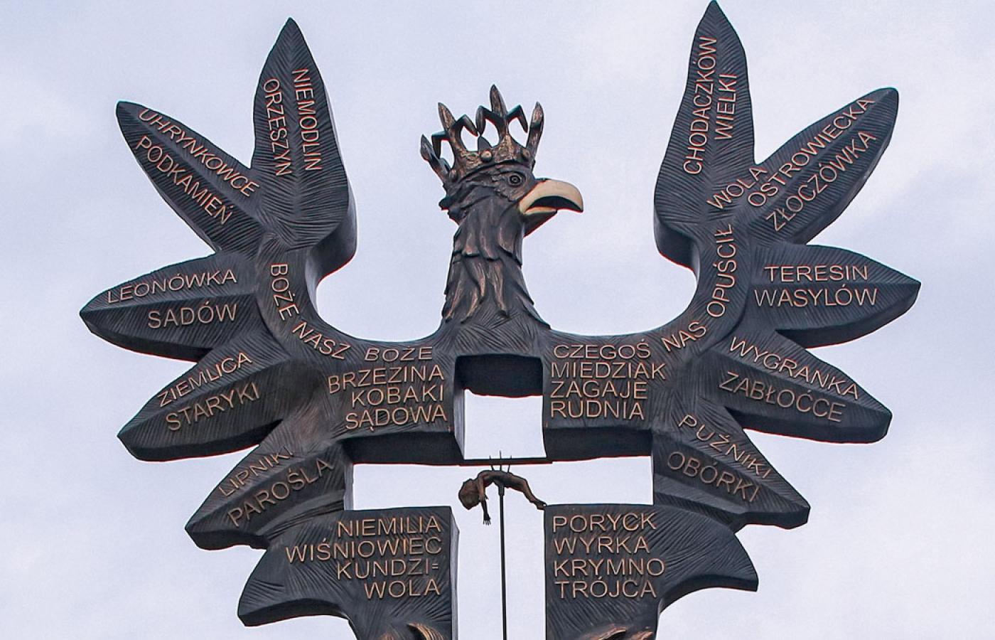 Monument w kształcie orła z koroną mierzy prawie 15 m. W skrzydłach rozpostartych na 7,5 m wpisano nazwy wiosek wymordowanych przez UPA. Z krzyża wyciętego w ptaku idą ku górze trójzębne widły (nawiązujące do ukraińskiego tryzuba), na które autor nabił dziecięce ciało. U podstawy bryły stoi płonąca czteroosobowa rodzina naturalnej wielkości. Za nią płot z trzema główkami na sztachetach. Czwarta rzucona na ziemię.