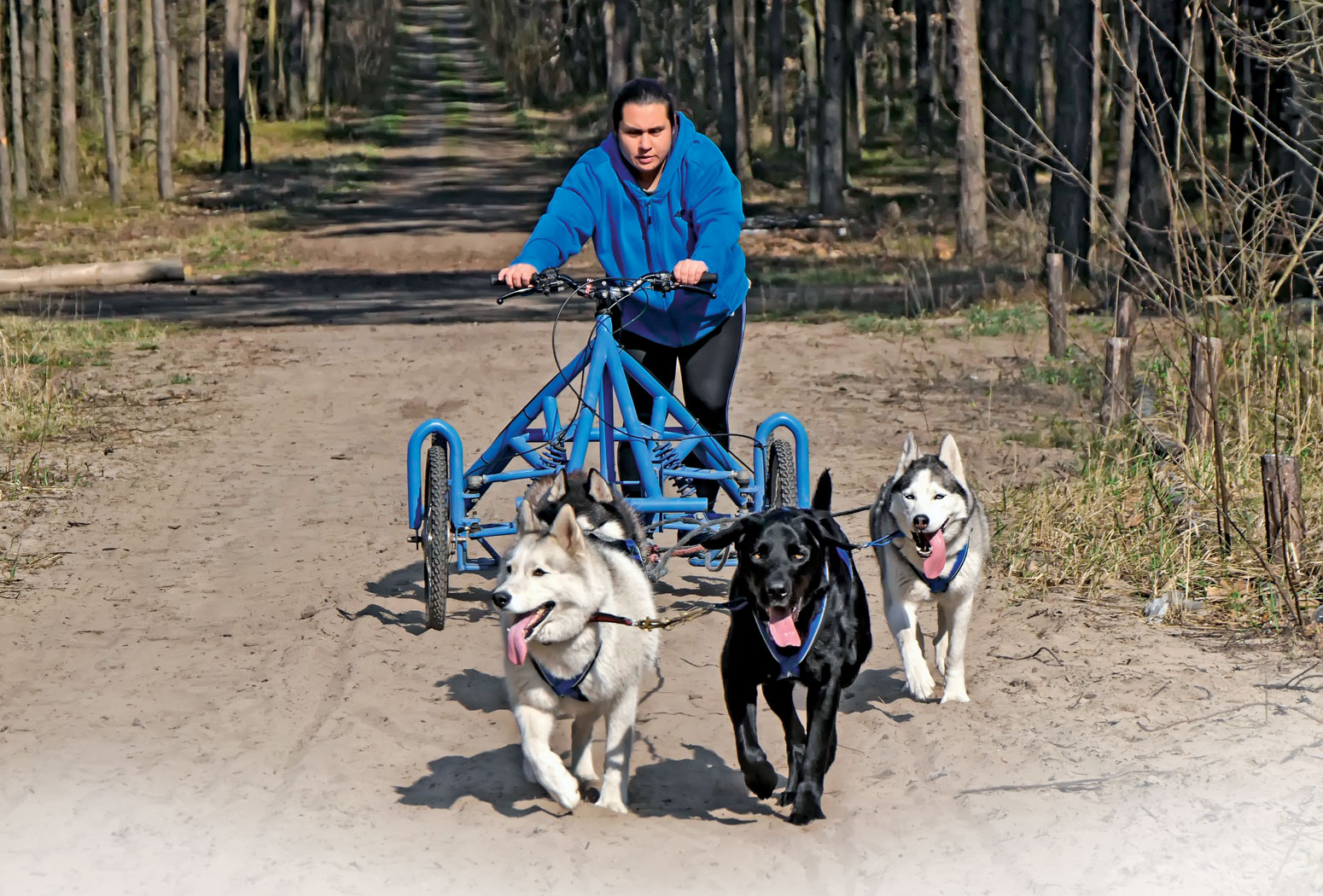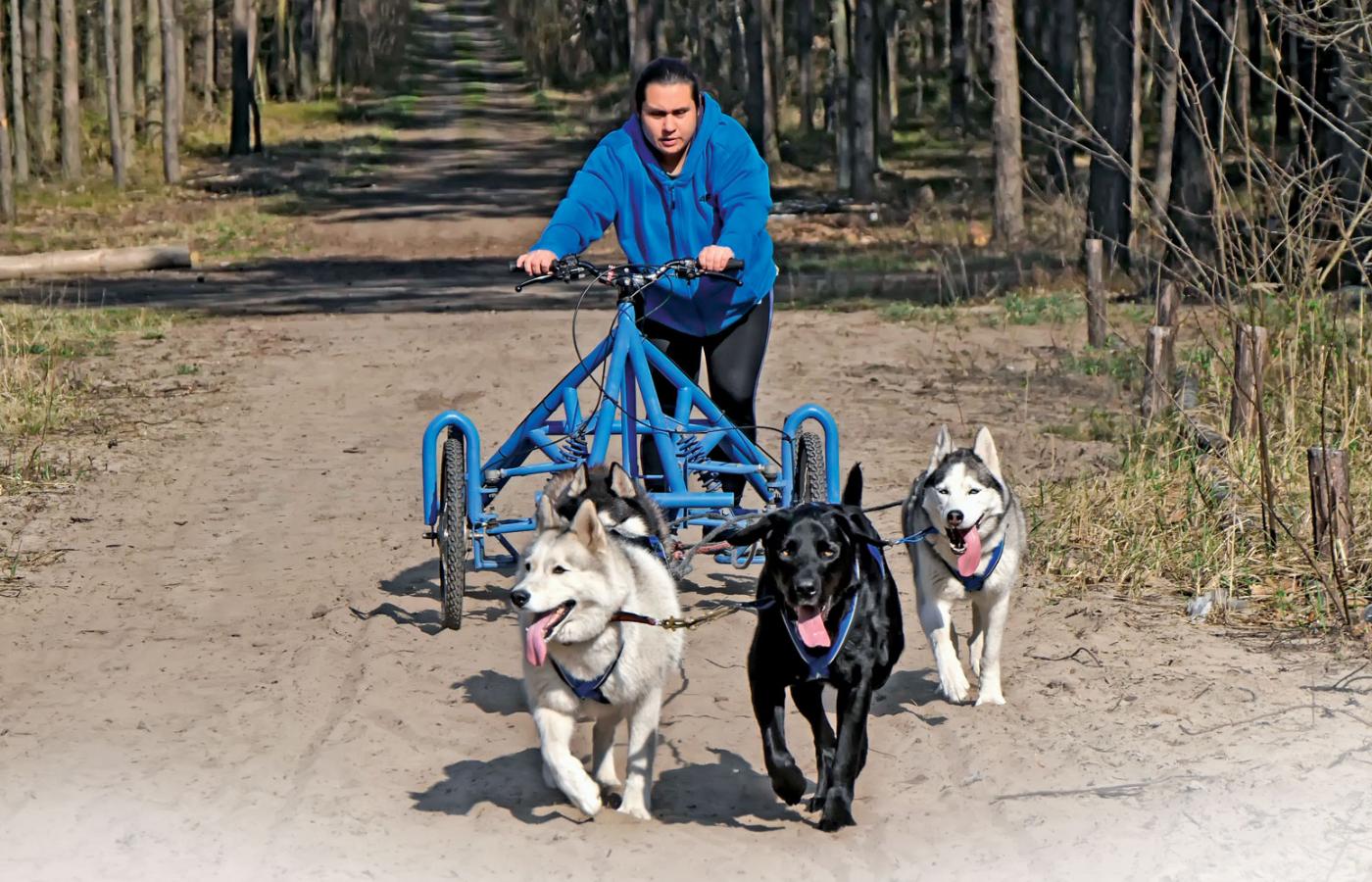 Przedstawicieli tej rasy często dotyka bezdomność. W każdym schronisku można znaleźć kilka w typie siberianów, a nierzadko i zupełnie rasowe z rodowodem. To wspaniałe psiaki, ale wymagające, bo bardzo aktywne. Trzeba im zapewnić dużą dawkę ruchu, inaczej się nudzą, uciekają (a potrafią pokonać bardzo wysokie ogrodzenie) i zaczynają polować. – Wtedy najczęściej ludzie, którzy kupili ślicznego puchatego szczeniaczka z niebieskimi oczkami, nie zdając sobie w ogóle sprawy z tego, jakie wymagania ma ta rasa, oddają go byle komu albo wyrzucają, żeby pozbyć się kłopotu – mówi Justyna. Tak trafił do niej Ziomek, 14-miesięczny wówczas pies w typie husky. Ważył zaledwie 15 kg (o 10 za mało). Po półrocznym leczeniu, kiedy nabrał sił i mięśni, zaczęła z nim jeździć na rowerze. Na pierwszych zawodach byli tylko pokibicować. A w 2010 r. zadebiutowali w bikejoringu (pies biegnie przypięty do roweru) w Warszawie i od razu zdobyli drugie miejsce. Od tamtej pory startowali już regularnie. Najczęściej w duecie, na rowerze, ale po roku startów Justyna kupiła hulajnogę i czasem podpinała do niej poza Ziomkiem jakiegoś psa, który był do adopcji i mieszkał u niej albo w innym tymczasowym domu. Dalej tak robi i znalazła w ten sposób, właśnie na zawodach, kilka domów dla swoich podopiecznych. W ciągu 10 lat wyadoptowała około 200 bezdomniaków.