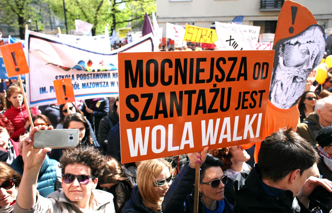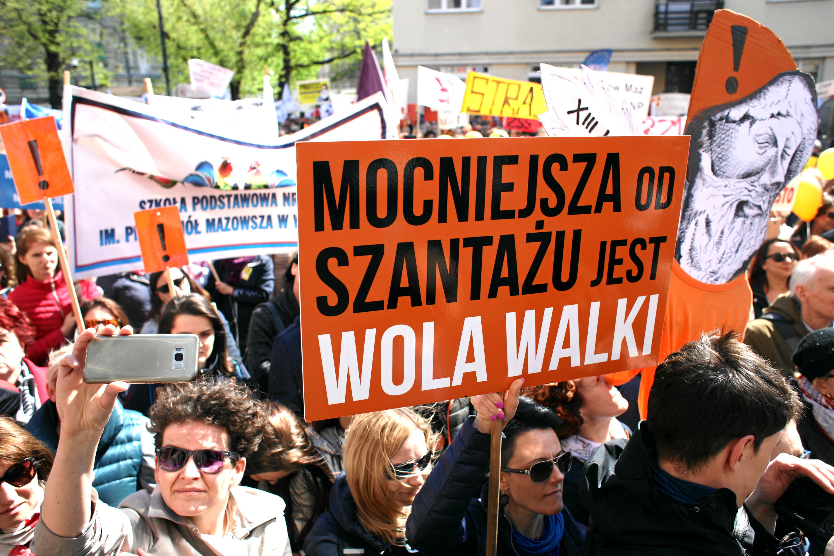 Społeczne akcje wsparcia protestu wciąż trwają. Po wczorajszych manifestacjach organizowanych przez ZNP w kilkunastu miastach dziś przed MEN przyszedł kolejny, tym razem zwołany oddolnie marsz nauczycieli i ich sojuszników. W pomarańczową koszulkę z wykrzyknikiem przyodziano wczoraj łódzki pomnik Kościuszki. Jeden z głównych argumentów podnoszonych przez OMKS na rzecz przeprowadzenia klasyfikacji tak, by nie blokować matur, dotyczy odbioru społecznego – i zachowania społecznego poparcia dla nauczycieli i ich strajku.