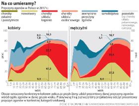 Główne przyczyny śmierci w Polsce to choroby krążenia i choroby nowotworowe, które odpowiadają za około 70 proc. zgonów. W Polsce poprawiła się wykrywalność chorób nowotworowych, ich diagnozowanie, ale leczenie i dostęp do specjalistów pozostawiają wiele do życzenia. Jeśli chodzi o choroby układu krążenia, wyczerpaliśmy już proste rezerwy – znacznie lepszą terapię i korzyści związane ze zmianą diety, które przyczyniły się do spadku umieralności z tej przyczyny zwłaszcza w latach 90.
