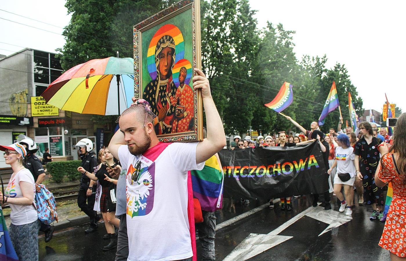 Po drugiej stronie płotu jest deptak, którym idzie Marsz Równości. Odpowiada drugiej stronie hasłem „Kolorowa Częstochowa”. Maszerujący na ramionach mają wieńce we wszystkich kolorach tęczy. Trasa wiedzie spod Jasnej Góry, przez centrum miasta i z powrotem do klasztoru.