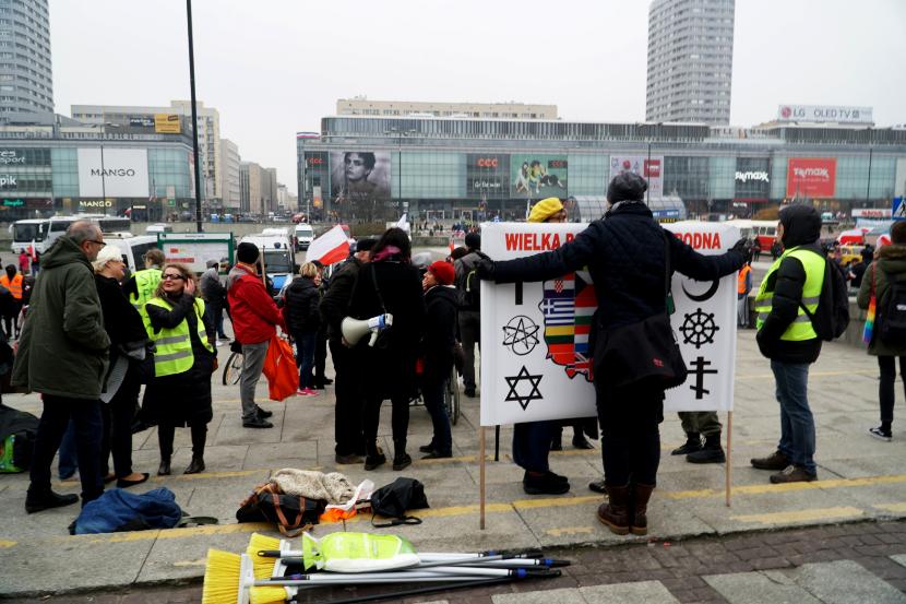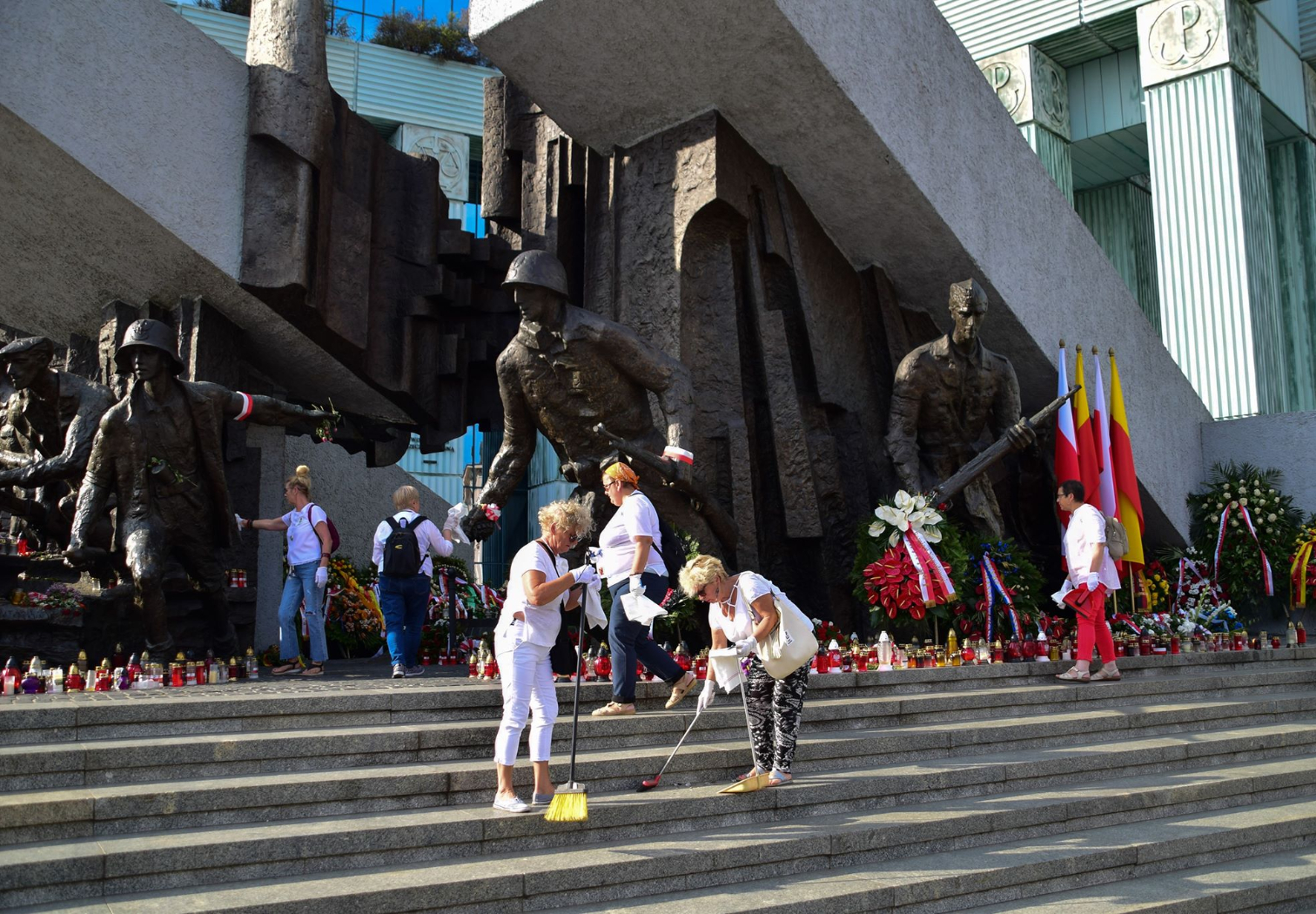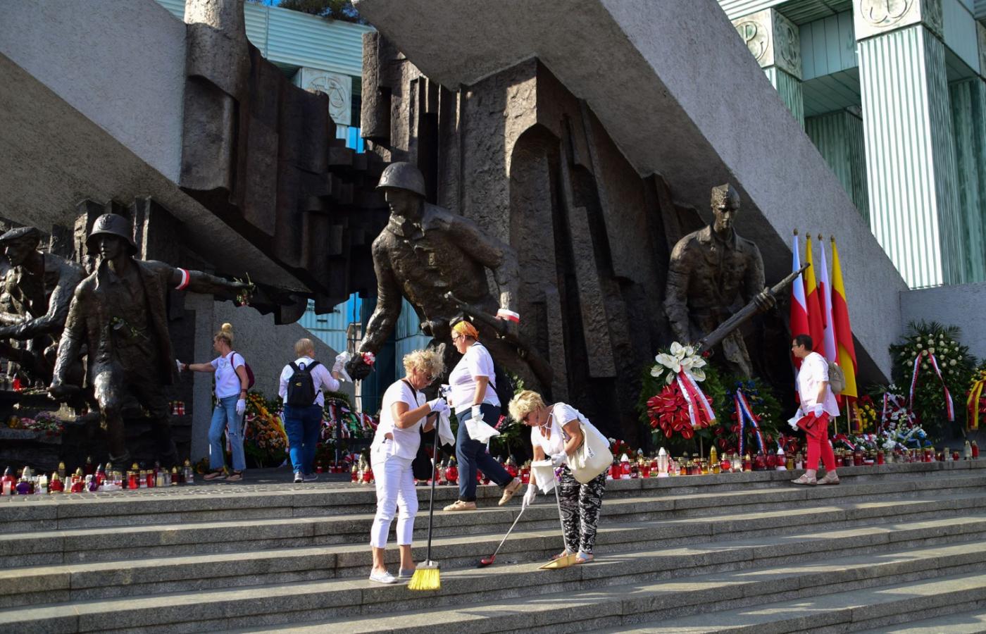 To m.in. przeciwko tej narracji protestowali na pl. Krasińskich Obywatele RP, których z miejsca siłą usunęła policja. I przeciwko tej narracji protestowali uczestnicy akcji sprzątania przed powstańczym pomnikiem. Mieli białe rękawiczki i maseczki antypyłowe. Sprzątali plac miotłami i zbierali drobne śmieci. Wrzucali je do czterech koszy, na których naklejono cztery przekreślone symbole – swastyki, sierpa i młota, krzyża celtyckiego oraz falangi.