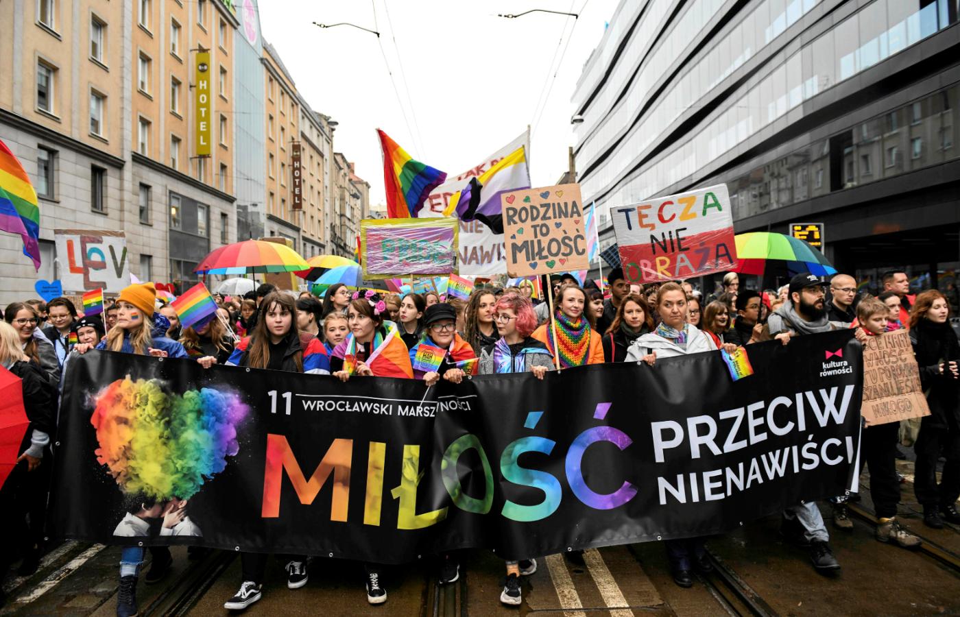 Na miejscu tęczowo; tęczowe parasolki, tęczowe torby, tęczowe flagi, tęczowe skarpetki. I deszczowo. Mokną transparenty „ABC, LGBT, XYZ”, „Jezus miał dwóch ojców”, „Mąż mojego syna to moja rodzina”.