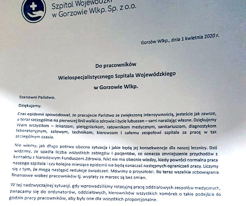 Potem przyszły gorsze wieści. W dyżurce w Wielospecjalistycznym Szpitalu Wojewódzkim w Gorzowie Wielkopolskim, gdzie pracuje, zastał list prezesów do pracowników: „Dziękujemy. Czas epidemii spowodował, że pracujecie państwo ze zwiększoną intensywnością, jesteście jak zawsze, a teraz szczególnie, na pierwszej linii walki o zdrowie i życie Lubuszan – sami narażając własne”.