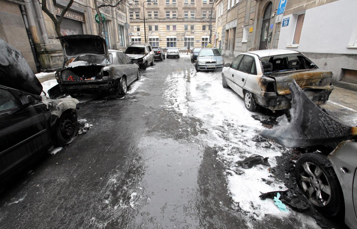 Wszystko nagrały kamery monitoringu miejskiego: honda CRV zaparkowana przy Chmielnej. Widać, jak mężczyzna pochyla się i najpewniej zapalniczką podpala tablicę rejestracyjną. Odchodzi. Płomienie szybko obejmują także stojącego obok volkswagena i skuter. Kilkanaście minut później, niedaleko, przy Alejach Jerozolimskich, zapłonął hyundai i30. Straty wstępnie oszacowano na 45 tys. zł.