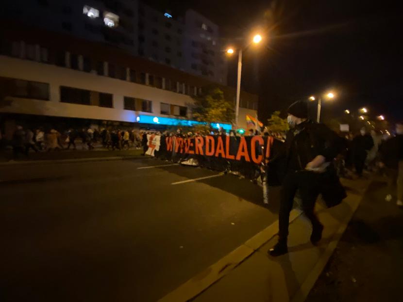 Kiedy około 22:00 policja otaczająca demonstrujących na Nowogrodzkiej wezwała do rozejścia się – z ich krótkofalówek było słychać, że mają w razie czego naciskać na ludzi – Klementyna Suchanow ogłosiła marsz na Żoliborz, gdzie mieszka Jarosław Kaczyński. Tłum ruszył za banerem z hasłem „Wyp*******ć”, bo „hasła bez przeklinania się skończyły”. Za tłumem odjechało 11 policyjnych suk.