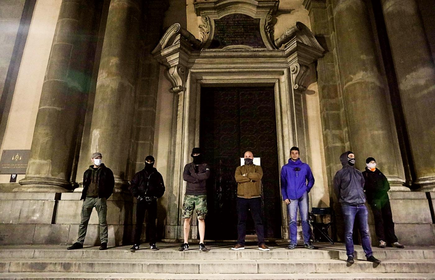 Kiedy pod koniec października strajkujące kobiety malowały hasła na kościelnych murach, a czasem wchodziły też do środka, by zaprezentować transparenty, wszechpolacy stworzyli „Samoobronę Wiernych”, a środowiska skupione wokół Rot Marszu Niepodległości – własną Straż Narodową. Cel: ochrona świątyń przed „atakami lewackich hord”. „Policja nie wykonuje swoich zadań. Albo robi to z premedytacją, albo nie jest już w stanie tego robić. Jej bezczynność skłania drugą stronę do coraz aktywniejszych działań” – wyjaśniał „Polityce” Robert Bąkiewicz.