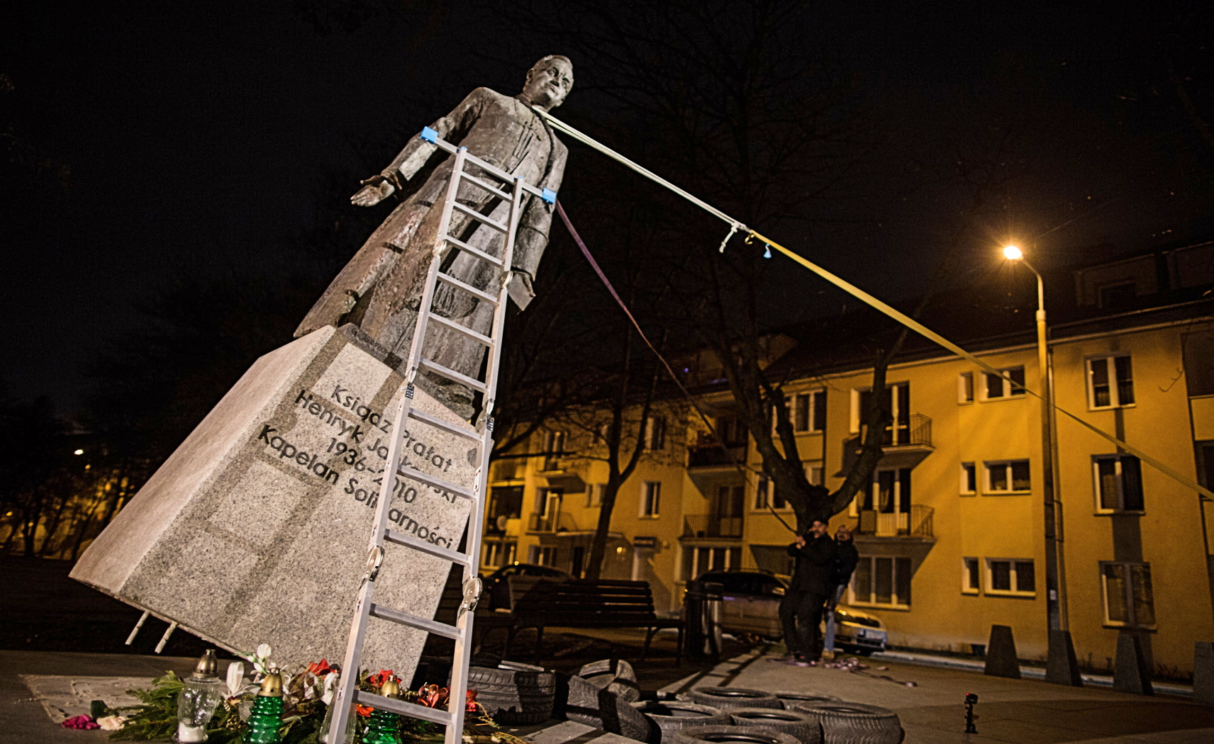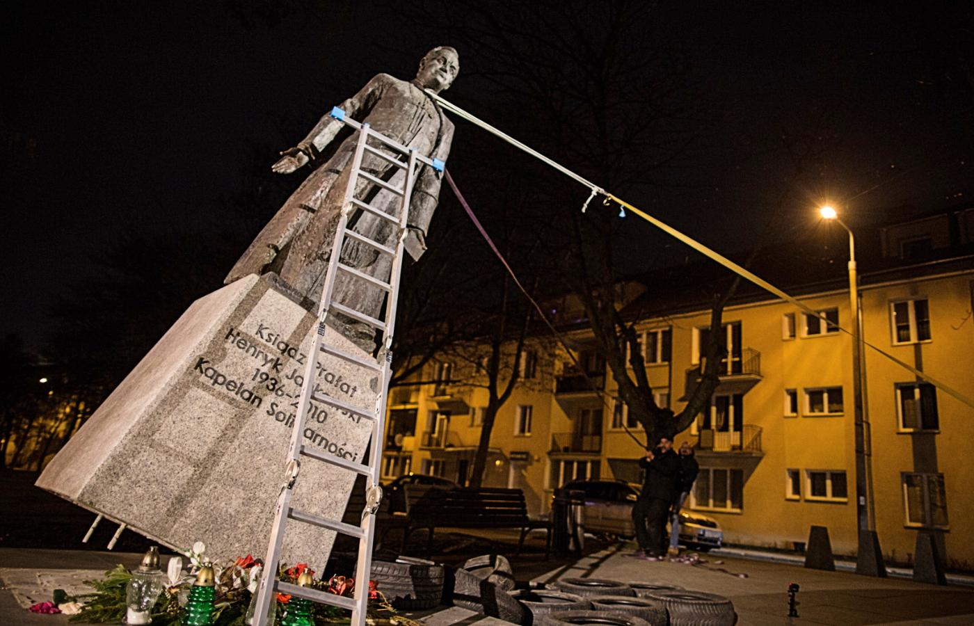 Minął grudzień, styczeń i spora część lutego 2019 r. Ale też 13 stycznia 2019 r. był zamach na prezydenta Adamowicza, pogrzeb, żałoba. 21 lutego 2019 r. trzej oskarżeni wzięli sprawy w swoje ręce. W nocy ściągnęli figurę prałata z cokołu. Obalili na przygotowane wcześniej opony, by nie doszło do zniszczenia. Tłumaczyli potem, że „celem jest rozbicie fałszywego i ohydnego mitu Henryka Jankowskiego, nie zaś – materii jego pomnika”. Nakręcili film z całej akcji, zawiadomili policję i poczekali na jej przyjazd. Sporządzili też manifest, w którym obszernie wyłożyli motywy swego postępowania.