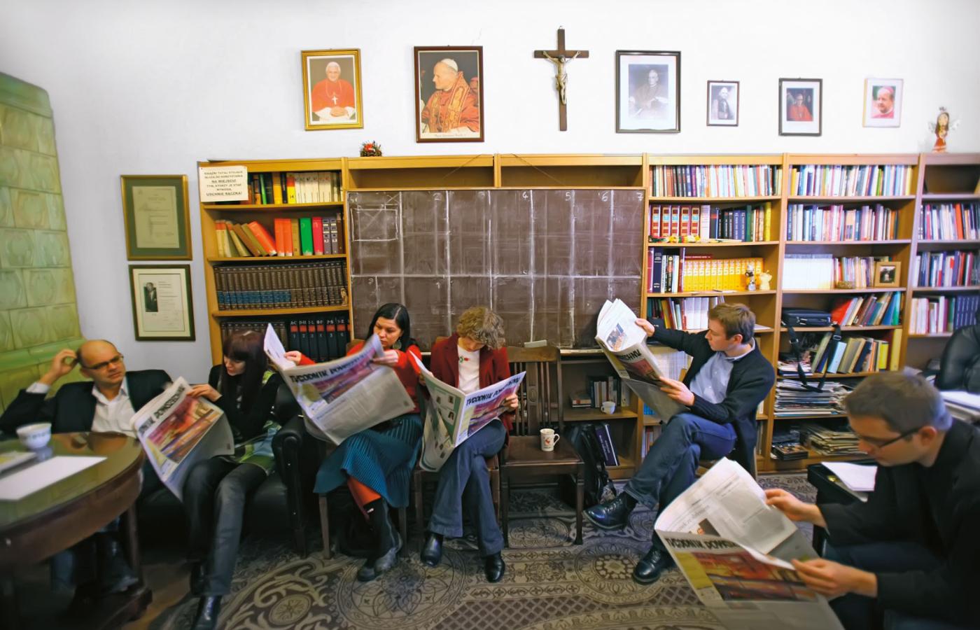 Zresztą potencjalni złodzieje mogliby się poczuć zawiedzeni, bo lokal wyposażony jest w duchu św. Franciszka. Nawet komputerów nie ma za wiele. Z racji skromnego metrażu – 280 m kw., własne biurka w redakcji ma garstka redaktorów i kilku dziennikarzy. Reszta pracuje w domach albo w systemie ciepłego biurka. Choć na internetowej stronie lista autorów ciągnie się jak napisy w hollywoodzkiej superprodukcji. Przy czym nie zawsze są to gwiazdy dziennikarskie, bo ludzi po dziennikarstwie nie ma w „Tygodniku” za wiele. – Do redakcji nie przyjmujemy po studiach, ale po owocach – mówią w redakcji.