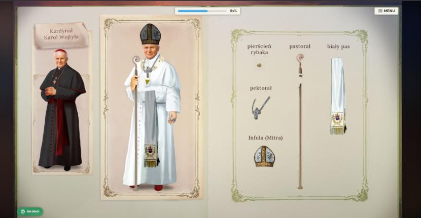 Własnoręcznie układamy zaproszenie na narodziny i chrzciny młodego Wojtyły, szeregujemy też w odpowiedniej kolejności (a właściwie: „kolejnośći”) czynności wykonywane przed Wigilią (tu jednak trudność: czy zakupów należy dokonać przed czy może po ubraniu choinki?). W segmencie „Habemus Papam” poznajemy w szczegółach procedurę wyboru papieża przez kolegium elektorów (o co gra później dopytuje). Siedmiolatki muszą również zrozumieć, czym są paliusz, pektorał, pastorał, mozzeta, infuła i piuska. A gdy już zrozumieją – mogą sobie w nagrodę ubrać papieską lalkę.