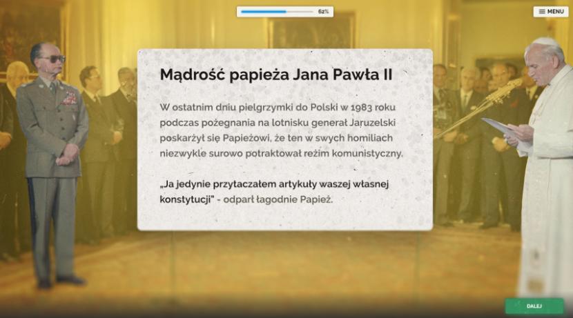 Szkołom ponadpodstawowym dedykowano m.in. dwa segmenty poświęcone papieskim pielgrzymkom. Segmenty, dodajmy, wyjątkowo nudne; gra zarzuca nas ścianami tekstu i archiwalnymi zdjęciami, by następnie zapytać, czy 20 czerwca papież mówił podczas mszy (o, przepraszam, „Mszy”) w Katowicach o: