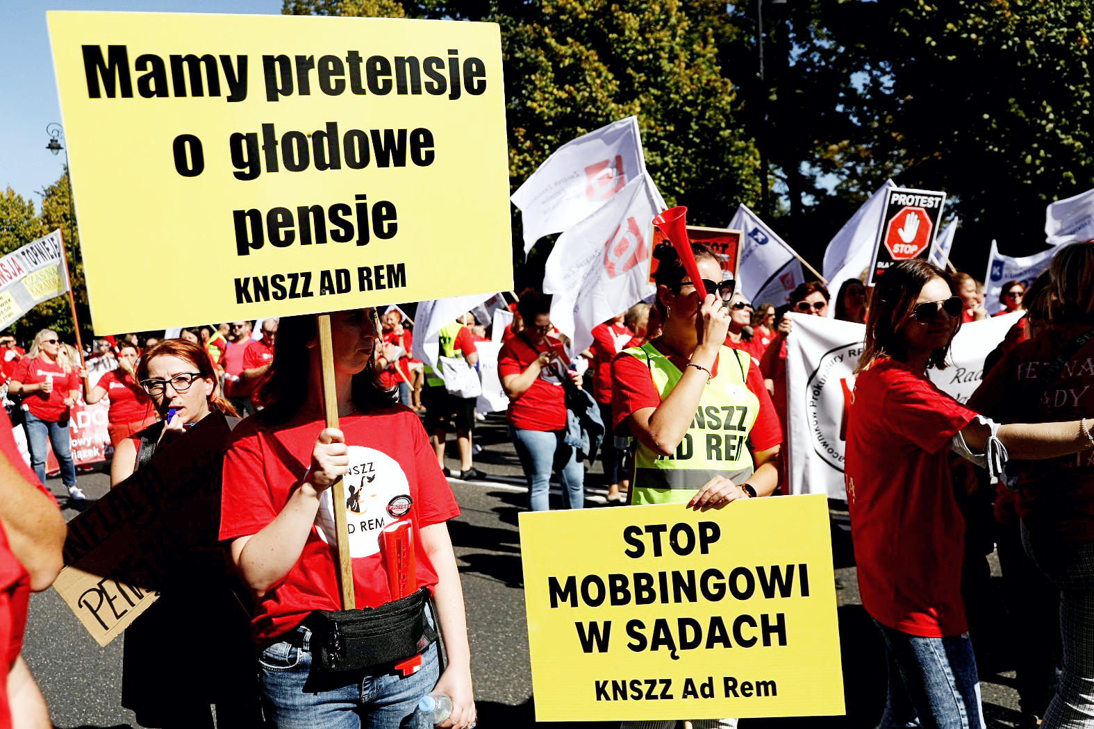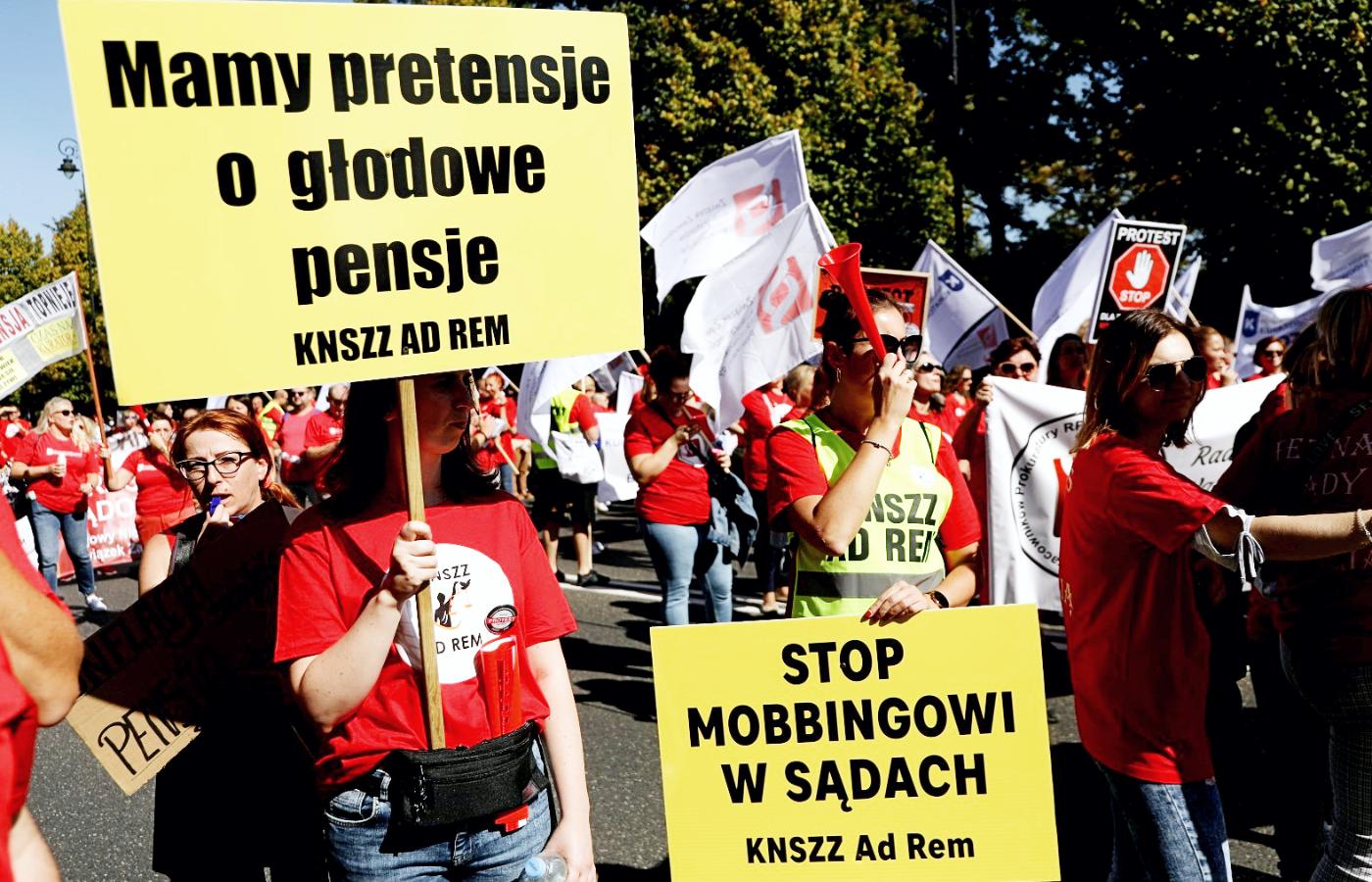 Atmosfera pracy w wielu polskich sądach jest już nie do zniesienia, ale nie możemy się z tym przebić do powszechnej świadomości, bo kto by pomyślał, że w „świątyniach sprawiedliwości” może w ogóle istnieć mobbing? – mówi Justyna Przybylska, szefowa związku zawodowego Ad Rem (skupia ponad 3 tys. osób spośród 40 tys. zatrudnionych w sądownictwie), który współorganizował jesienne manifestacje pracowników sądownictwa. Wśród ich postulatów płacowych transparenty „stop mobbingowi” przeszły w mediach niezauważone, podobnie jak ten o „zobowiązaniu ministra sprawiedliwości do natychmiastowego podjęcia realnych i konkretnych działań w celu wykorzenienia mobbingu”.