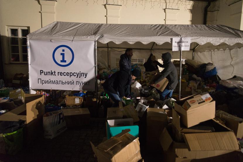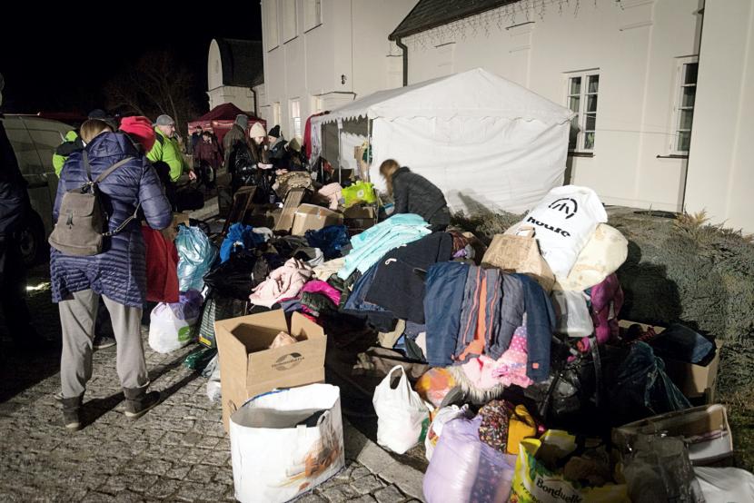 Z parkingu ruszam na niewielki plac przed pałacem. Rozstawiono tu dwa namioty, między nimi krąży kilkadziesiąt osób, trudno się połapać, kto jest kim, i czuć pewną nerwowość. Po kilku minutach już wiem, jakie jest źródło tego napięcia: tłum tworzą wolontariusze segregujący zwiezione „w darze” rzeczy, głównie ubrania, kosmetyki, produkty higieniczne i spożywcze, wolontariusze gotowi tłumaczyć z ukraińskiego i na ukraiński, wolontariusze serwujący ciepłe posiłki, wolontariusze obsługujący punkt recepcyjny... Strażacy, uczynni panowie z Chełmskiego Klubu Morsów w ramach wolontariatu serwujący barszcz i pakujący prowiant do rozwiezienia na przejścia graniczne oraz zawsze obecni gapie. A także osoby z wypisanymi na kartonach nazwami miast, do których są gotowe bezpłatnie zawieźć przybyłe z Ukrainy „kobiety i dzieci”, a właściwie to kogokolwiek, kogo uda im się na tę podwózkę namówić. Bo – jak zaczynam się orientować – najtrudniej tu wypatrzyć przybyszów z Ukrainy.