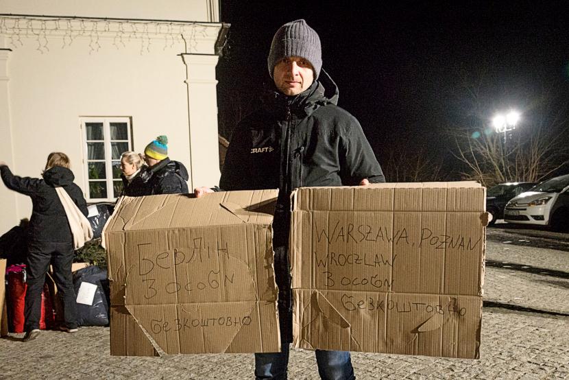 Okręcam się na pięcie i staję twarzą w twarz z mężczyzną trzymającym dwa zapisane czarnym flamastrem kartony. Od razu pytam, czy mogę zrobić zdjęcie, bo na jednym z nich są co prawda całkiem popularne kierunki, jak Warszawa, Poznań i Wrocław, ale na drugim widzę Berlin. To Jan, przyjechał z kolegą Mathiasem z Drezna, każdy swoim samochodem. – W jednej chwili zdecydowałem, że po prostu trzeba przyjechać i pomóc. Wielu z moich przyjaciół albo jest w drodze, albo wpłaca pieniądze czy zbiera rzeczy potrzebne na granicy lub w Ukrainie. Dużo jest solidarności wokół tej sprawy – mówi Jan. I dodaje, nawiązując do niedawnego kryzysu na polsko-białoruskiej granicy: – Bardzo się cieszę, że także Polska jest tak otwarta na pomoc ukraińskim uchodźcom.