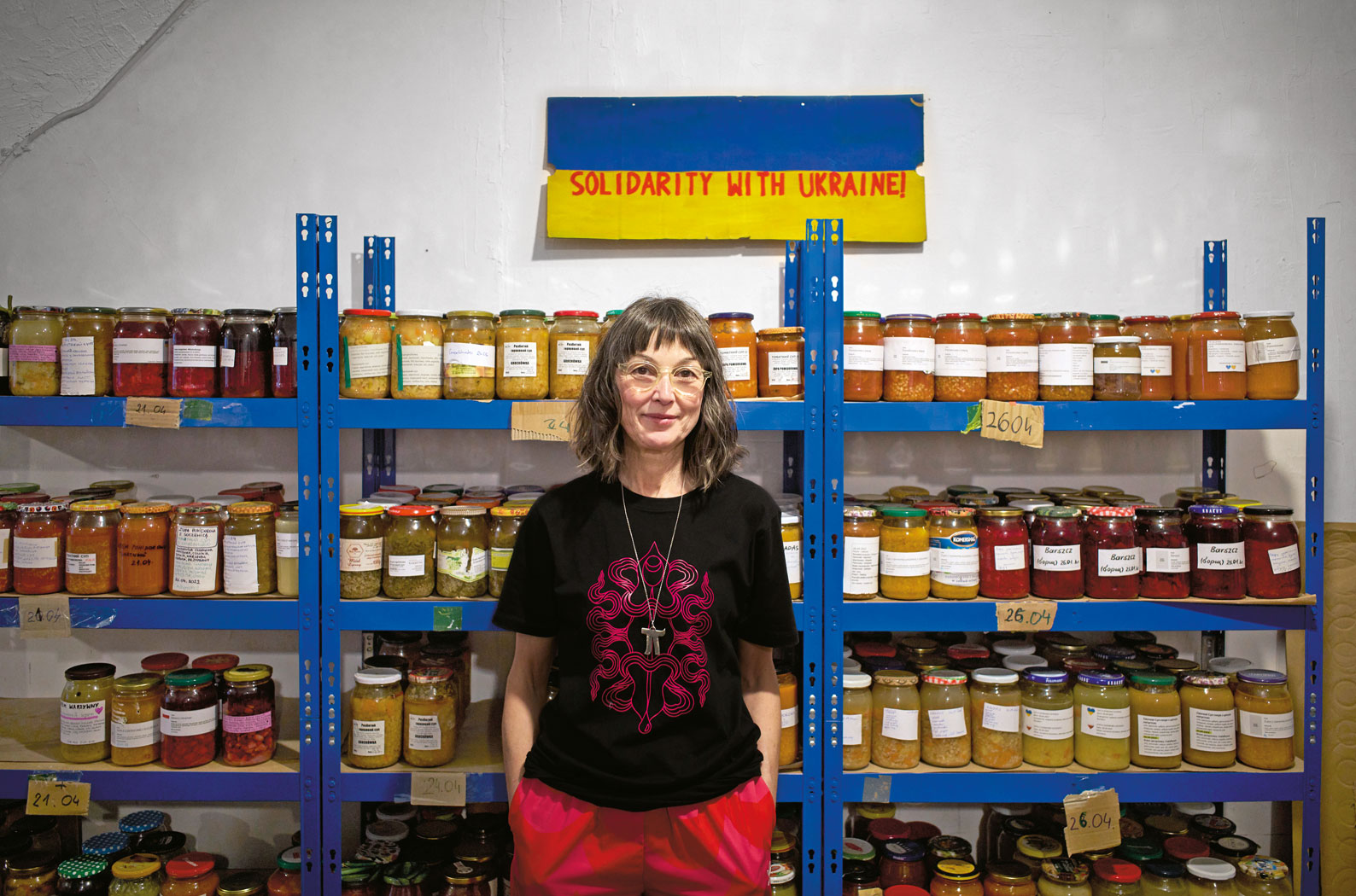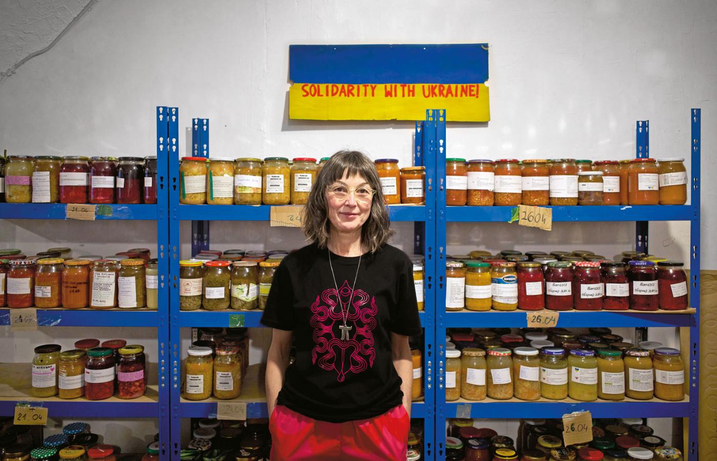 Kolejka przed Składem Solnym w Centrum Sztuki Współczesnej „Wiewiórka” w Krakowie ustawia się jeszcze przed otwarciem. Głównie kobiety z dziećmi. Przychodzą po zupę w słoikach, suchy prowiant wydawany w sklepiku, chemię, kosmetyki. 1500 osób dziennie. I tak od ponad dwóch miesięcy. Trzeba jeszcze pakować słoiki z zupą w kartony. Pojadą do Ukrainy; dla żołnierzy, szpitali i sierocińców. Jutro wysyłka – około 1200 litrów zupy. To ciężka fizyczna harówka.
