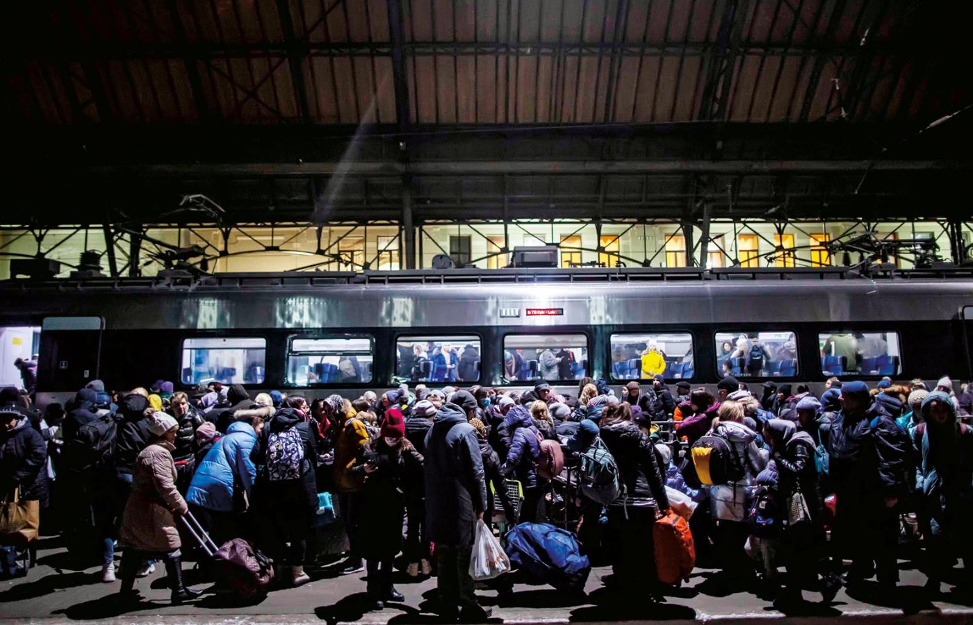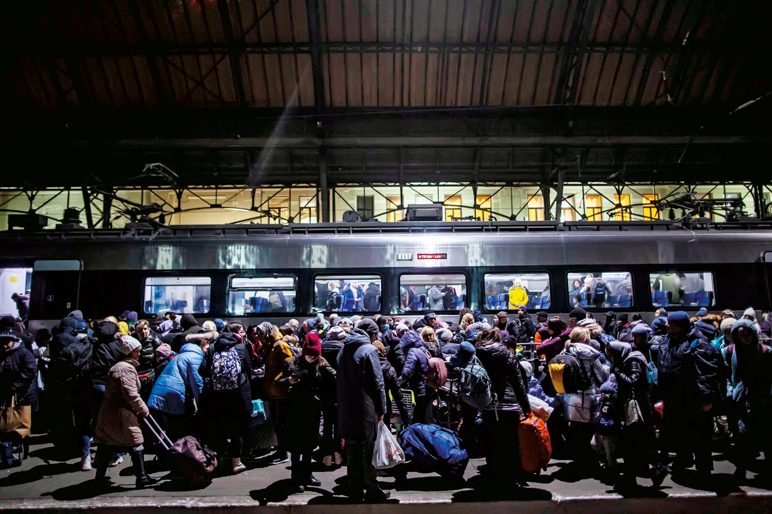 Peron dla wahadła specjalnie dobrany – boczny i ślepy. Dzięki temu nie widać z dworca kolejki pasażerów. Wahadło (majatnyk) to ukraiński pociąg, który ciągle jest w drodze między Przemyślem a Kijowem. Nowoczesny, bilety sprzedaje przez internet. Ma przewidziane rozkładem godziny, ale są nieważne – wahadło rusza, kiedy może. W końcu to pociąg jeżdżący przez wojnę. Cicho, mówią matki dzieciom, trzeba czekać. Kolejka do wahadła to jakieś pół tysiąca ludzi w deszczu, i wciąż ich przybywa. Młode kobiety wpatrzone w tablety, żonglują mejlami, pracują. Jakaś ze słuchawkami w uszach długo tańczy w kolejce. Mokry płaszcz, wymyślne i szerokie figury. Dzieciate kobiety parskają śmiechem.