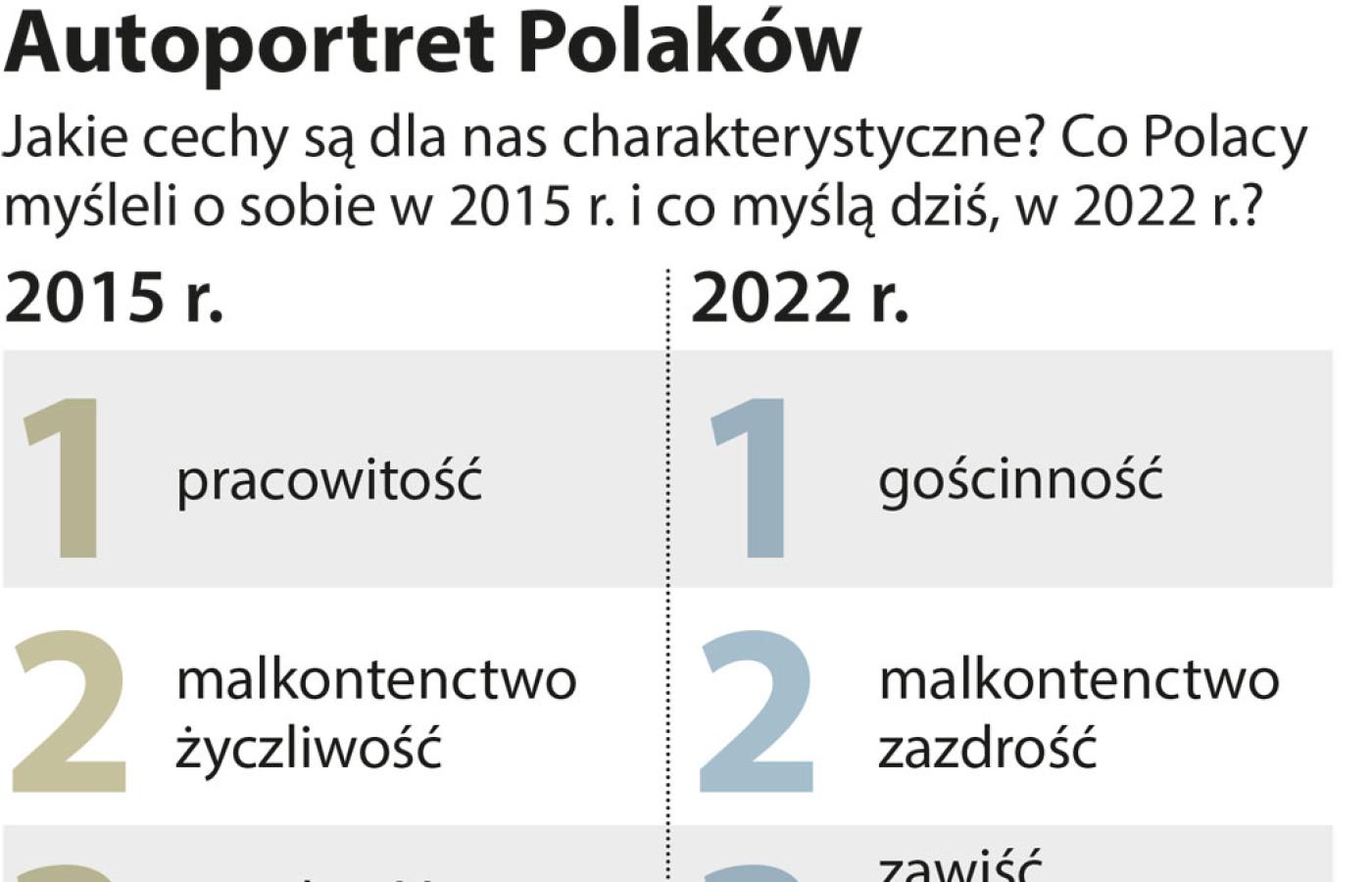 Jacy zatem byliśmy siedem lat temu? Za punkt wyjścia przyjmijmy autoportret Polaków, jaki wyłonił się z badań CBOS w 2015 r., czyli dokładnie u zarania prawicowo-populistycznej ery politycznej. Respondentom nic nie sugerowano, poproszono o wskazanie cech właściwych typowemu Polakowi. Ponad 90 proc. jakieś cechy wymieniło, połowa wskazań to były zalety, połowa – wady. Nie był to więc autoportret wyidealizowany.