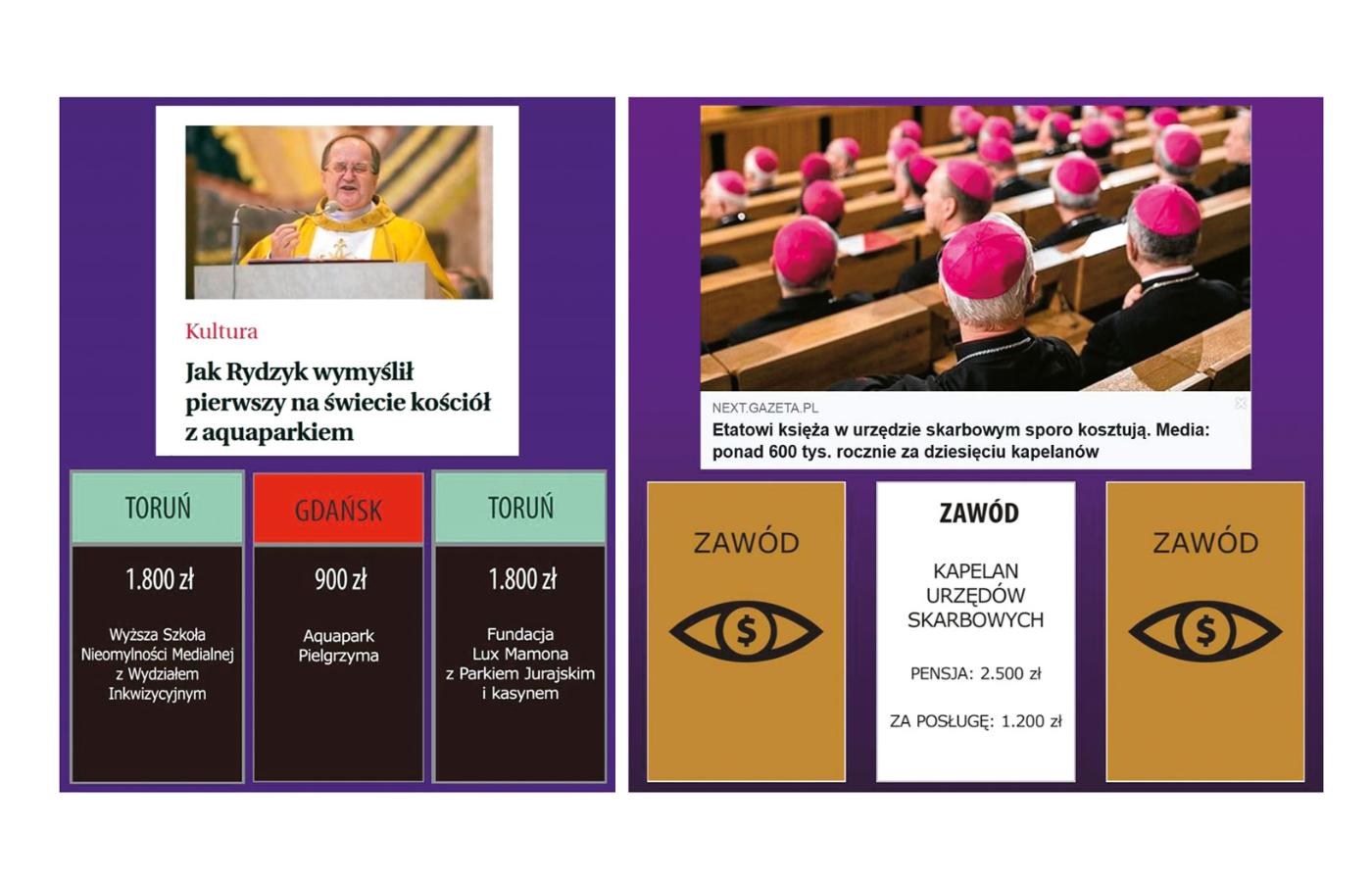 „Gmina sprzedaje ci grunt pod cele sakralne. Płacisz grosze, ponieważ masz 98 proc. bonifikaty. W miejsce obiecanego hospicjum budujesz centrum handlowe i kapliczkę. Inkasujesz 1000 zł”. Żart? Beka z księży? Skądże znowu. To, jak i wszystkie inne cudowne wydarzenia opisane na służących do gry kartach „Opatrzność” i „Cuda”, zdarzyło się naprawdę, a kiedy i gdzie, gracze dowiadują się z dołączonej broszurki, która podaje linki do artykułów (także z POLITYKI) i publikacji na portalach internetowych.