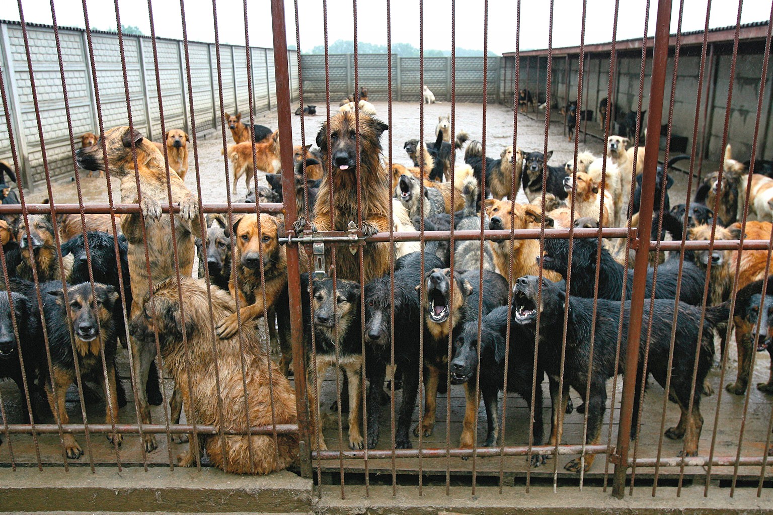 Podczas drugich oględzin psów było znacznie mniej – ok. 400. Siedziały pojedynczo, w betonowych boksach, już większych, bo w międzyczasie zmieniły się przepisy. Kojce powiększono, wybijając jedynie dziurę między dwiema celami, czasem tak małą, że większe psy musiały się przeciskać. Budy – często bez zadaszenia, w niektórych jest słoma, w innych tylko przegniłe resztki. Betonowa podłoga zalana wodnistą biegunką. Miski puste. Niemal wszystkie psy w bardzo złym stanie psychicznym, widać, że prawie nigdy nie opuszczały klatek. Bo wybiegi – ustawa nakazała, że mają być – były raczej nieużywane, trawa na tych ogrodzonych fragmentach terenu z tabliczką „Wybieg” na furtce niezadeptana.
