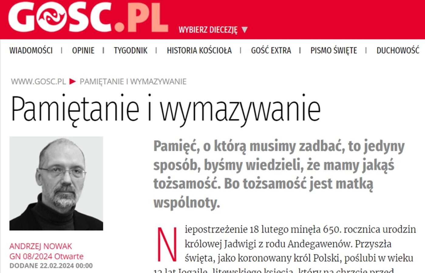 W felietonie „Pamiętanie i wymazywanie”, wychodzącym od upamiętnienia 650. rocznicy urodzin królowej Jadwigi, wzywa do poszanowania i odnawiania pamięci, „która pozwala nam zachować świadomość tego, kim jesteśmy, co dziedziczymy i jakie stąd wynikają dla nas obowiązki”, co „brutalnie zderza się z rzeczywistością współczesną, w której wymazywacze pamięci wydają się znów być górą”.