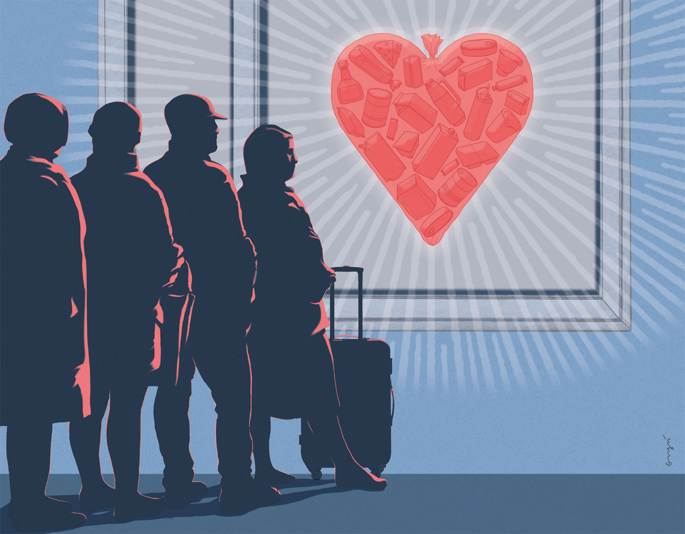 Jest wielka gonitwa myśli przed wydawką, zanim otworzy się okno z towarem. Ręce błądzą po kieszeniach, głowy nikną za pazuchą i wyłaniają się na powrót z pływającym spojrzeniem.