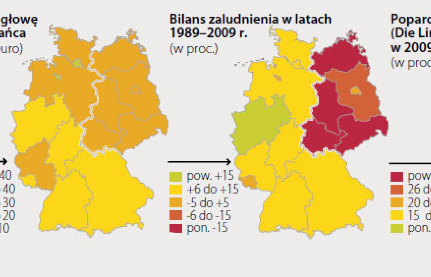 Po zjednoczeniu w byłej NRD nasilił się proces depopulacji: spadł i tak niski przyrost naturalny, a nie udało się zahamować migracji na zachód. Według najnowszych danych codziennie przenosi się na zachód, głównie do Bawarii i Hesji, 140 osób. Od zjednoczenia wschód stracił 1,5 mln ludzi, a od 1945 r. – bez mała 5 mln! I końca nie widać. W ciągu najbliższych dziesięciu lat Turyngia czy Saksonia-Anhalt mogą stracić do jednej trzeciej ludności, twierdzi dyrektor berlińskiego Instytutu Demografii i Rozwoju Rainer Klingholz. Ale, jego zdaniem, to nie katastrofa: „Niemcy potrzebują pustych przestrzeni, które ze względów klimatycznych należałoby zalesić”.