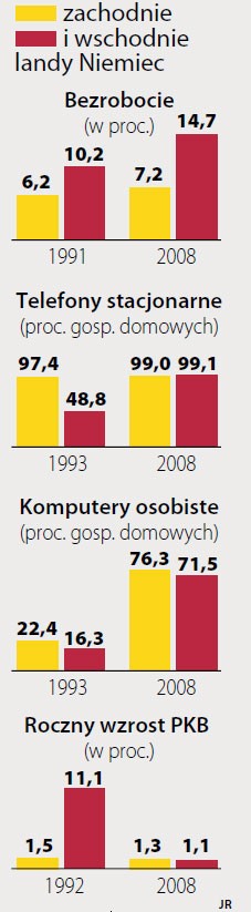 Równolegle do prywatyzacji rozbudowano i unowocześniono infrastrukturę. W 1992 r. nowe landy wytwarzały zaledwie 3,4 proc. ogólnoniemieckiej produkcji przemysłowej, w ubiegłym roku już niemal 10 proc. Również wyraźnie wzrosła wydajność pracy. W 1991 r. wschód osiągał mniej niż jedną czwartą zachodniej wydajności pracy, w ubiegłym roku już 78,3 proc. Niemniej nadzieje na błyskawiczny wzrost gospodarczy okazały się płonne. Pod koniec lat 90. skończył się boom budowlany, wkrótce też zaczęły się kurczyć subwencje i przestały rosnąć płace – od 10 lat wynoszą dwie trzecie zachodnich. Stagnację płac ułatwia fakt, że na wschodzie związki zawodowe są słabe, oraz nadzieja, że dzięki „dumpingowi płacowemu” Niemcy wschodnie będą atrakcyjnym miejscem inwestycyjnym.