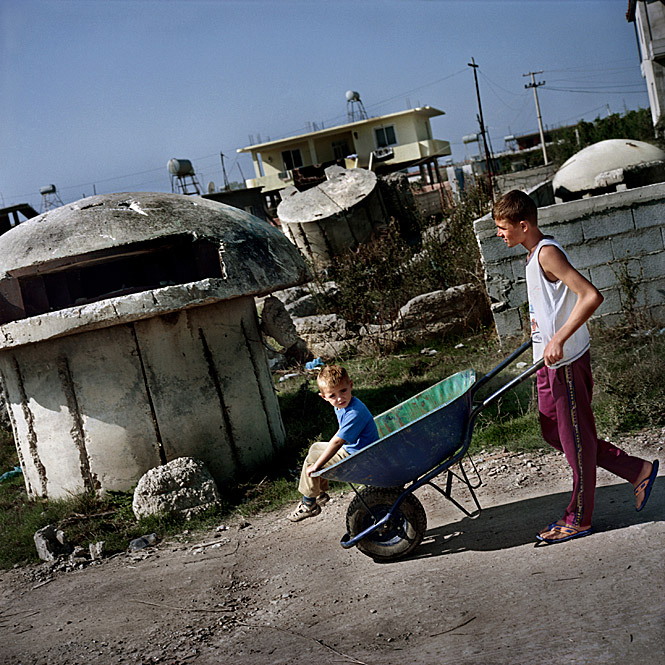 Dalej są jeszcze inne pojemniki, cylindryczne, nie wiadomo na co, tuż przy jednostce wojskowej. Jednostki pilnuje trochę wystraszony młodzik z karabinem, a obok niego zakazy fotografowania, zakazy przejeżdżania, zakazy patrzenia – wymalowane tu na cześć fotografa, który kiedyś usiłował wtargnąć na teren jednostki; ale po tej wizycie wezwano wojskowego malarza i on wymalował na bramie wszystkie zakazy, jakie znał. A za bramą, oprócz setek bunkrów, jest też hotelik, więc te wszystkie napisy po nic.
