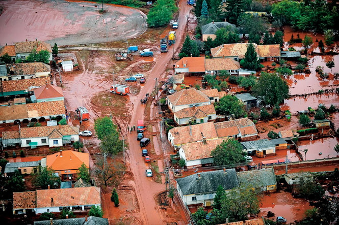 Był pochmurny październikowy poniedziałek, 10 minut po południu, gdy osunął się narożnik ziemnego wału, okalającego zbiornik nr 10 przy hucie aluminium w mieście Ajka, 160 km na zachód od Budapesztu. Wał rozmiękł, rozstąpiły się betonowe płyty, którymi go obłożono, i spomiędzy nich runął milion metrów sześciennych czerwonego szlamu, produktu ubocznego w procesie wytwarzania aluminium metodą Bayera. Rwąca fala w kolorze ochry w ciągu 15 minut dotarła do sąsiadującej z hutą maleńkiej miejscowości Kolontár, chwilę później do miasteczka Devecser i parła dalej na Zachód, wzdłuż doliny potoku Torna.