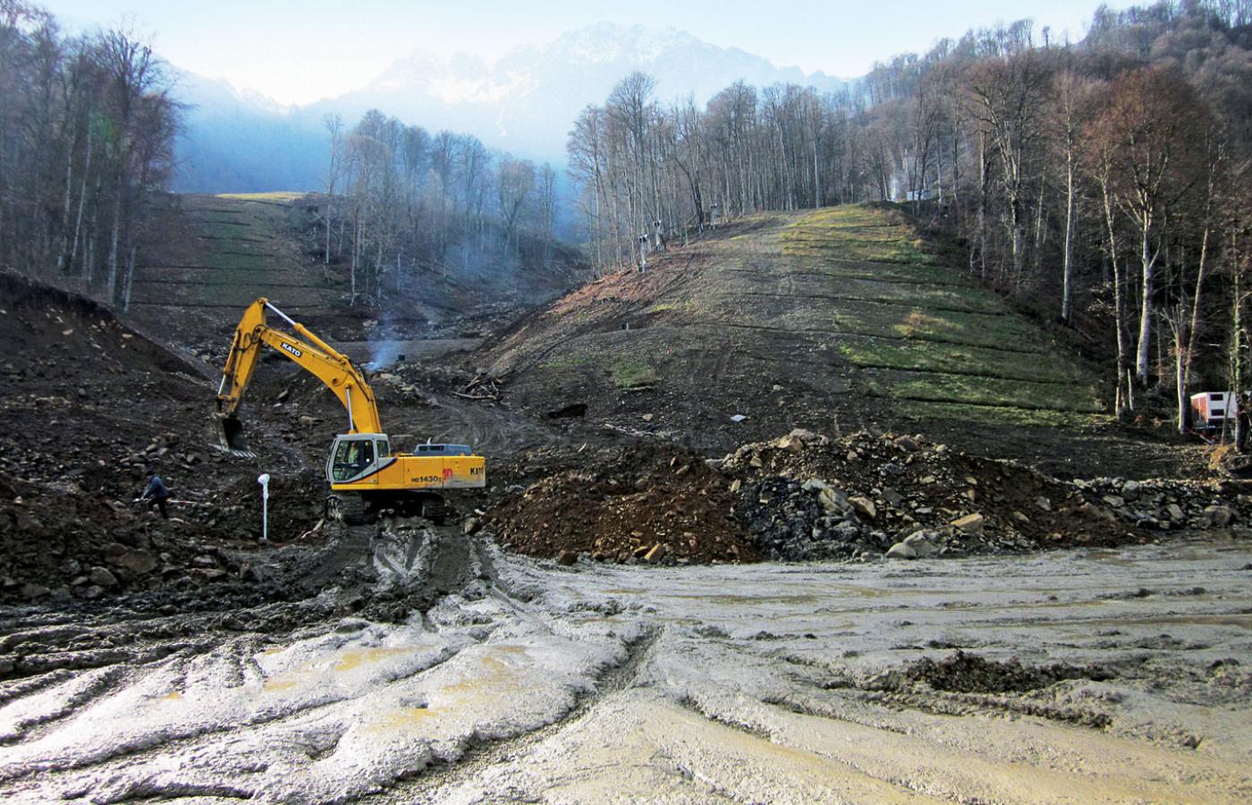 W Krasnej Polanie, podobnie zresztą jak w Soczi, bez wytchnienia pracują budowlańcy. Buldożery wytyczają trasy zjazdowe, a technika bezlitośnie wgryza się w góry. Na trzecim poziomie, do którego dociera nowiutka kolejka linowa Gornaja Karusel (Karuzela Górska), oblepiona reklamą państwowego Sbierbanku, pracuje ciężki sprzęt. Dopiero spojrzenie w dół zbocza uświadamia, że wszystko to dzieje się na wysokości 2200 m. Robotnicy zapewniają, że na tej wysokości zimą jest ponad dwa metry śniegu. Zresztą nikt nie ma wątpliwości, że nawet jeśli śnieg nie spadnie z nieba, to zostanie na miejsce dostarczony innymi sposobami. Latem, w czasie rekordowych upałów, mówił o tym Dmitrij Miedwiediew: „Trzeba pomyśleć o wariantach zapasowych”.