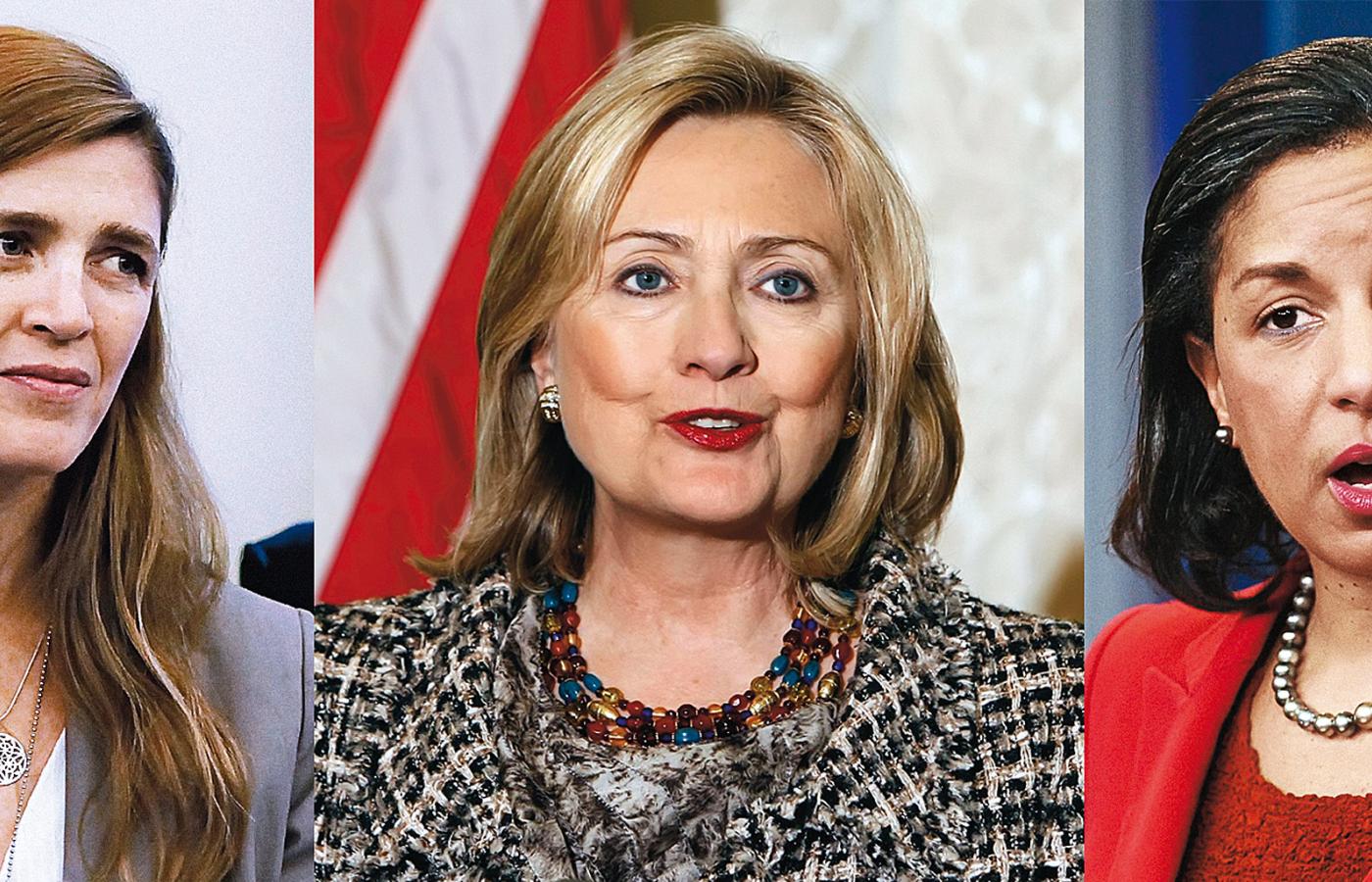 Hillary Clinton jeszcze dwa dni wcześniej była przeciw. Jak pisze „Washington Post”, zdanie zmieniła po powrocie z Bliskiego Wschodu, gdzie usłyszała wezwania pomocy, i z Europy, gdzie zobaczyła gotowość działania. Według „New York Timesa” na spotkaniu z Obamą sekretarz stanu USA poparła dwie pozostałe orędowniczki interwencji: Susan Rice i Samanthę Power. Rice jest stałym przedstawicielem USA w Radzie Bezpieczeństwa, a w 1994 r. odpowiadała za Afrykę w Departamencie Stanu, kiedy Bill Clinton bezczynnie przyglądał się ludobójstwu w Rwandzie. Z kolei Power, zanim zaczęła doradzać Obamie w Radzie Bezpieczeństwa Narodowego, zdobyła Pulitzera za książkę o amerykańskiej polityce wobec ludobójstwa, a w latach 90. jako reporterka oglądała z bliska wojnę w Bośni.