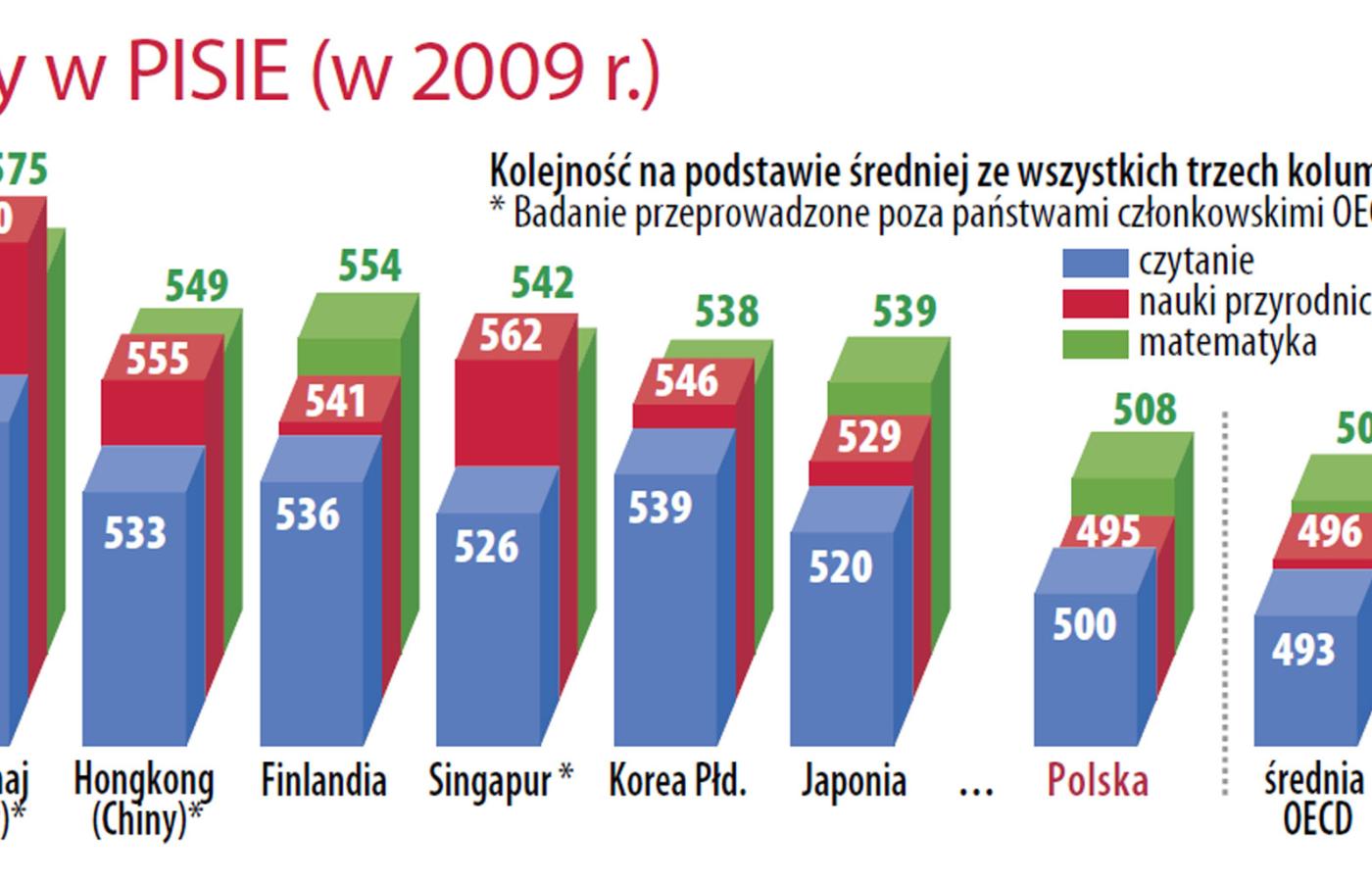 Świetnych wyników 15-latków w badaniu PISA zazdroszczą Finom nawet Azjaci. Choć badanie organizowane jest co trzy lata w kilkudziesięciu państwach członkowskich OECD, zaproszono do niego także Szanghaj i Hongkong, które zresztą niezmiennie należą do liderów trzech poprzednich rankingów. Ale tamtejsi Chińczycy wcale nie są zadowoleni. Ich dzieci wypadają znakomicie, tyle że sukces okupiony jest gigantyczną liczbą korepetycji, zajęć dodatkowych, kursów przygotowawczych i wieczorowych, prowadzonych także w weekendy i święta. Prof. Scheinin: – Mówiono mi w Szanghaju, że aż 80 proc. uczniów korzysta z dodatkowej nauki, dlatego niepokoją ich nasze wyniki, osiągane bez dodatkowego wysiłku. Podobnie inspiracji poszukują także pozostali dalekowschodni tytani testu PISA, Japonia i Korea Płd., gdzie rozziew w wynikach między poszczególnymi szkołami jest większy niż w Finlandii.