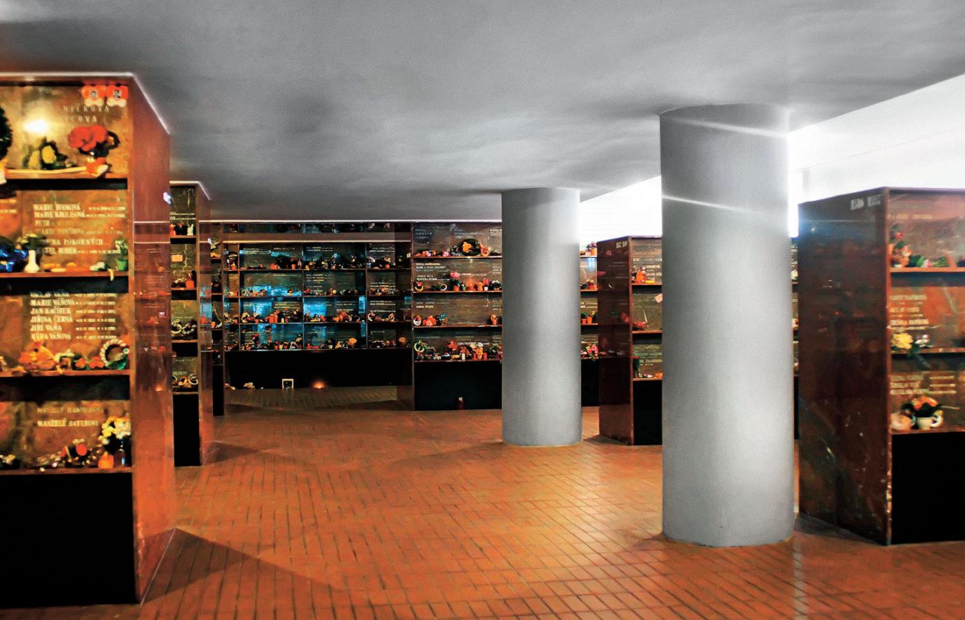 Na Vinohradach nisze nie są przeszklone, zamykają je kamienne płyty, na których widnieją nazwiska. W głównym pomieszczeniu fontanna i olbrzymi alegoryczny obraz „Przewóz oczyszczonych dusz przez morze zapomnienia”. Kolumbarium zyskało sławę wśród turystów, stąd na fontannie prośba, aby nie wrzucać do niej monet. I tu, podobnie jak w Holešovicach, na wielu niszach przyklejone są karteczki z prośbą do najemców o kontakt. Powodem jest zaleganie z opłatami. Wynajem niszy nie jest drogi, w zależności od kościoła to od pięciu do dziesięciu euro rocznie. Zarządzający kolumbariami nie śpieszą się z usuwaniem urn z niezapłaconych nisz. Wysyłają wezwania, ale jeśli przez dłuższy czas nikt się nie zgłosi, urna przenoszona jest to zbiorowego grobu znajdującego się na jednym z praskich cmentarzy.