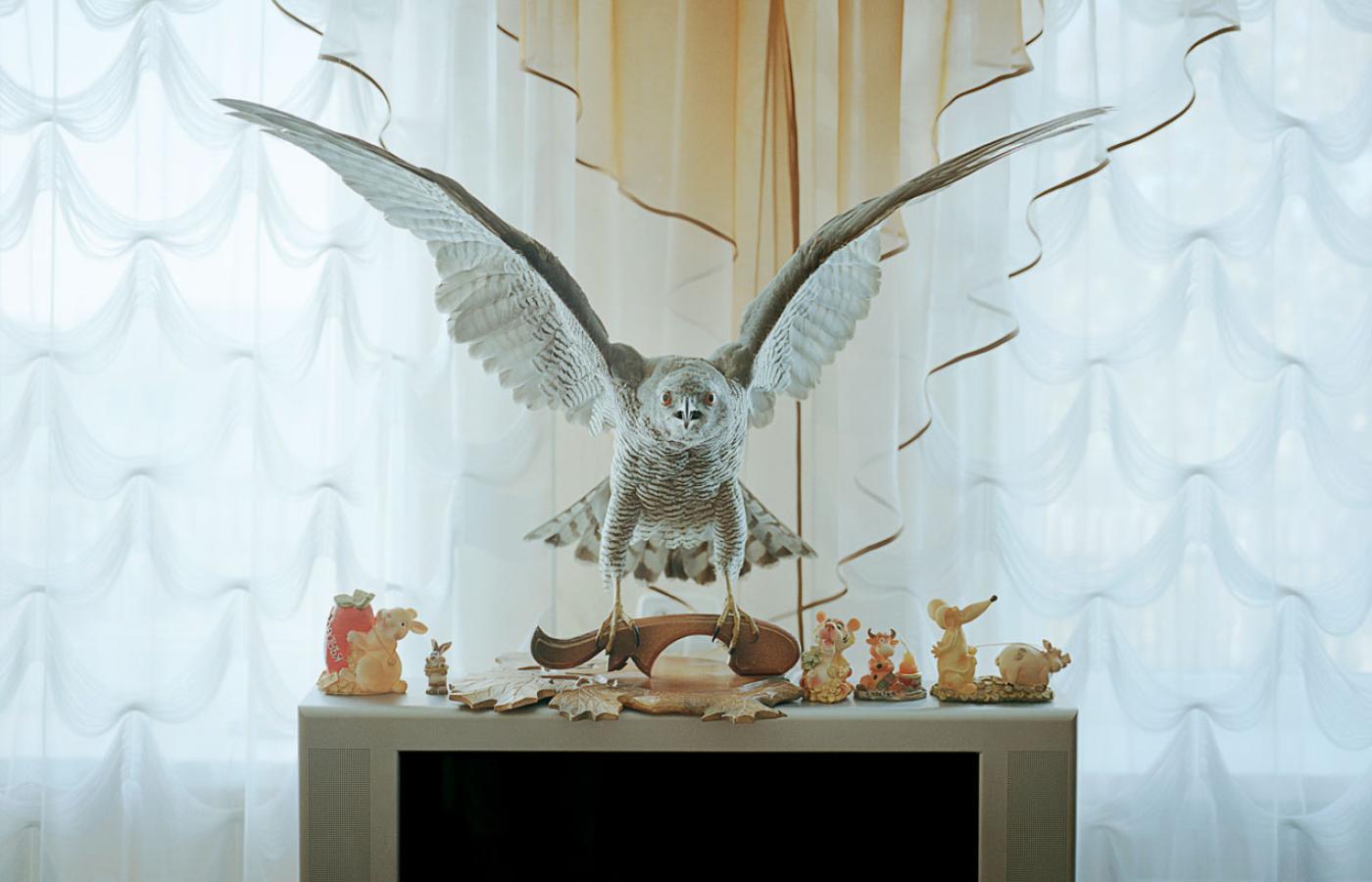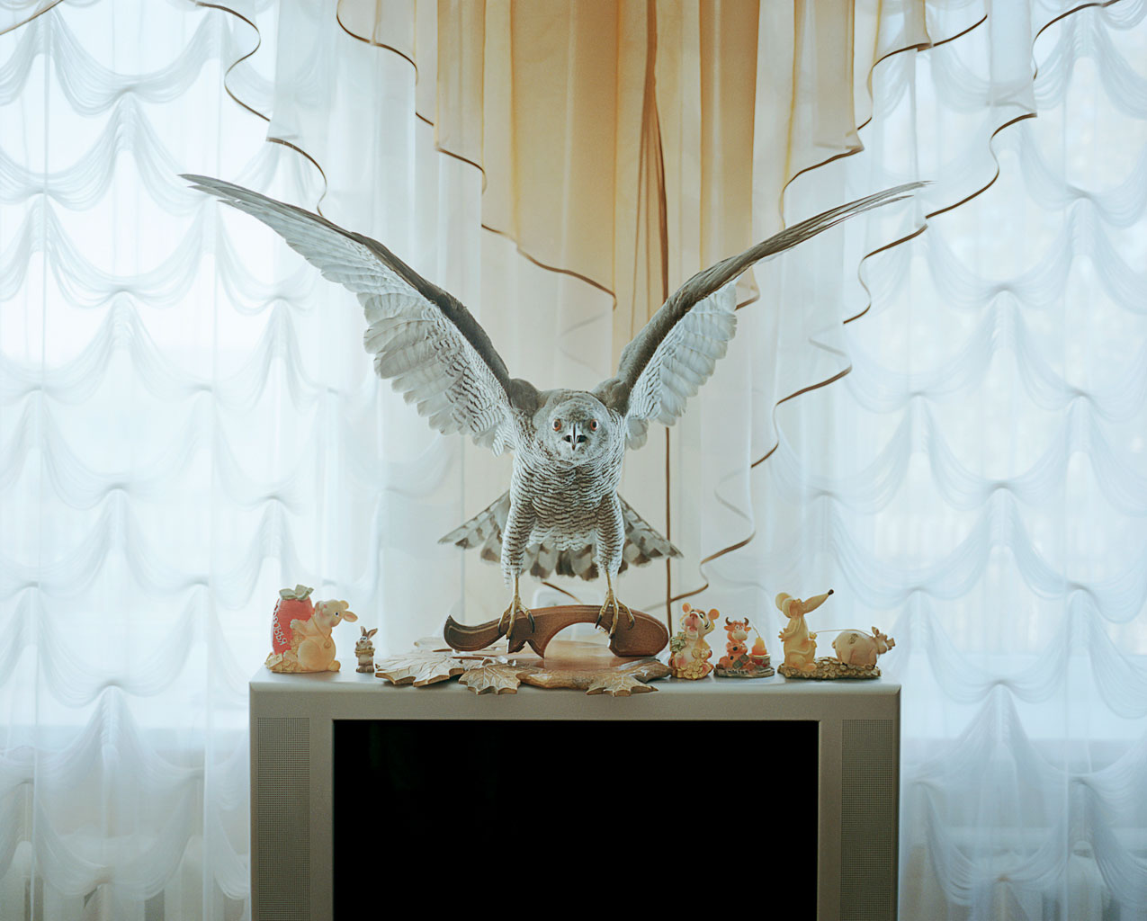 O tam, na stole, obok mikrofali – żubr. Sama czaszka, wygotowana, jeszcze nie wiem, co z nią zrobię. Skóra i mięso poszły do miasta. Jak zamówisz w knajpie wołowinę i będzie specyficznie twarda, to jesz starego żubra. Tylko do starych się strzela, taki odchodzi od stada, żeby samemu zdechnąć. Za tym tydzień łaziłem, strzeliłem dopiero, gdy widziałem, że mu zostało nie więcej niż parę godzin. Naszyjnik miał z czipem. Zdjąłem i powiesiłem na drzewie. Siedemset kilo mięsa było.