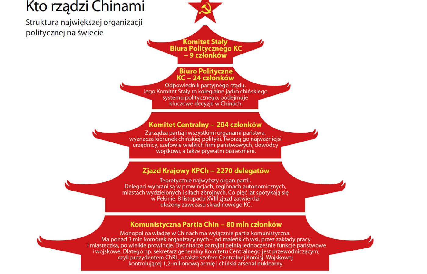 Kwiaty na ulicach to powitanie dla 2 tys. partyjnych delegatów, którzy zjadą do Pekinu na XVIII Zjazd KPCh jednak z początkiem listopada. Wtedy w Wielkiej Hali Ludowej przy Tiananmen bez oporu przyjmą wnioski zaproponowane przez kierownictwo. Wśród nich przegłosują skład czwartej generacji chińskich przywódców: wybór przyszłego przewodniczącego ChRL, za granicą zwanego zwyczajowo prezydentem, ale także przyszłego szefa rządu, cały komitet centralny, jego biuro polityczne oraz dziewięciu członków komitetu stałego biura politycznego KC, czyli kolegialnego jądra decyzyjnego partii. Zanim zmieni się obsada najważniejszych stanowisk i instytucji, za pomocą których 80-milionowa partia rządzi najliczniejszym państwem globu, toczyć się będzie brutalna walka o władzę, a także o kształt Chin, politykę wobec kryzysu i przyszłość partii.