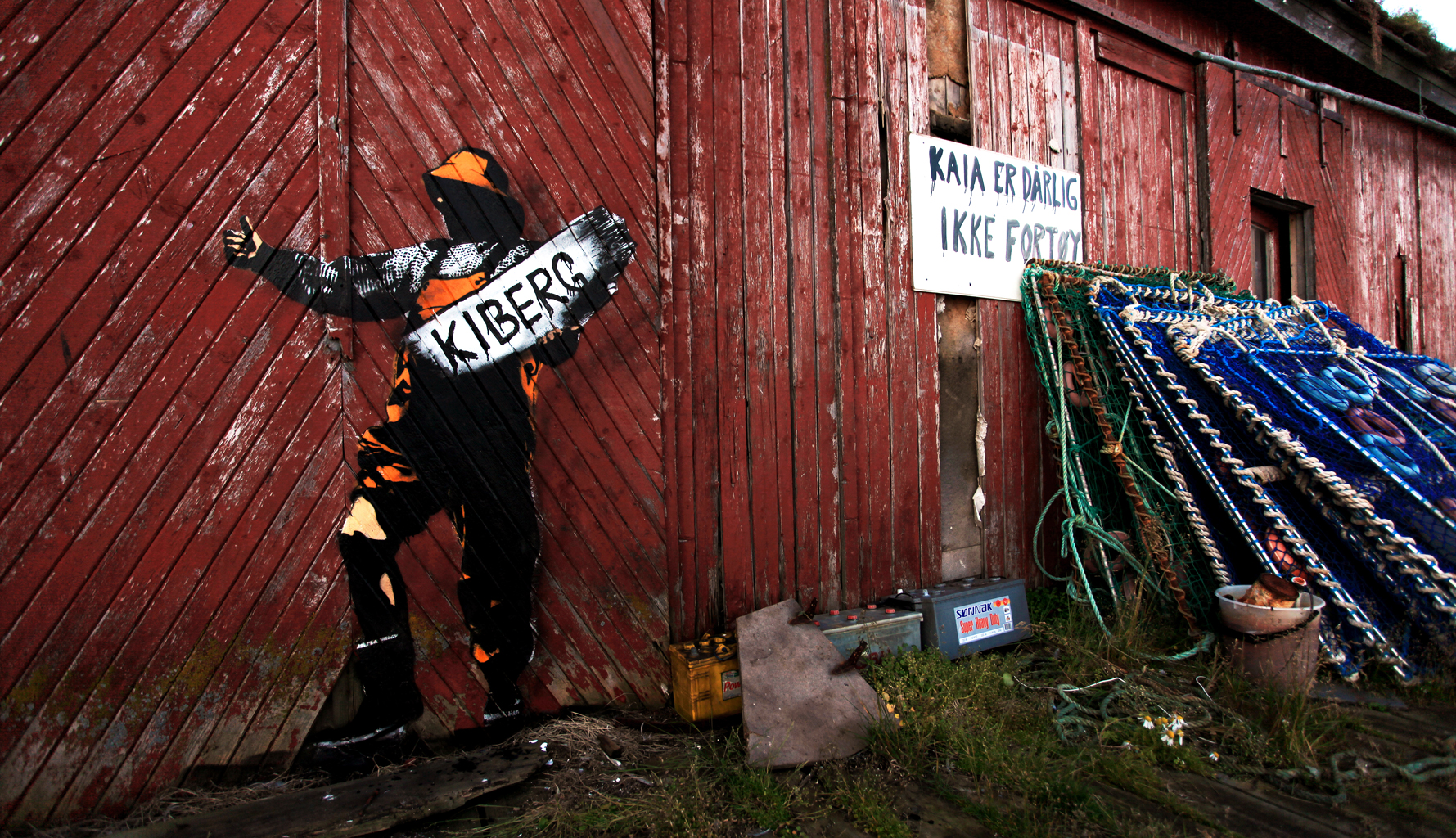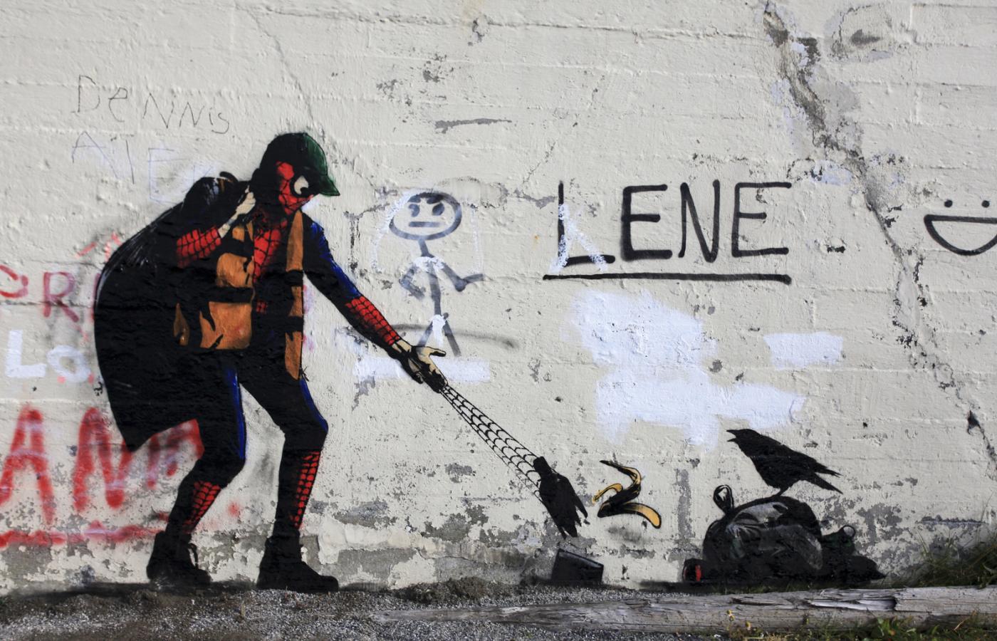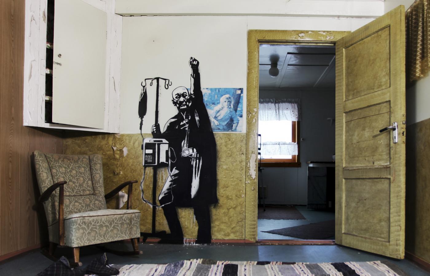 Miejsca też wybiera nietypowe. Nie ulicę, nie miasto, a kompletne odludzie. Dom pośrodku niczego. Ścianę z widokiem na nic. Na stojącym siłą woli drewnianym budynku na końcu polnej drogi napisał białą farbą „Street art” (Sztuka ulicy). Na innym, szczerbatym od ubytków w deskach, wymalował wielkie „Together we fall apart” (Razem się rozpadamy). Na martwym kaszalocie wyrzuconym na brzeg napisał po prostu „Pøbel”. Oto rybak w klasycznym norweskim stroju i wełnianym swetrze, z deską surfingową pod pachą. Gdzie indziej staruszek strzelający z laski czy Robin Hood kradnący sejf. Ślepe okna, surowy krajobraz północnej Norwegii i te samoopowiadające się historie. Robin pcha wózek inwalidzki z brzuchatym i przygarbionym Batmanem, Superman unosi triumfalnie ramię do góry, nie za wysoko, żeby sobie nie wyrwać wenflonu, a Spiderman jedną ręką zdejmuje z twarzy maskę, drugą opierając się o rehabilitacyjny balkonik. Stare twarze i pomarszczone ciała, obleczone w obcisłe kombinezony.
