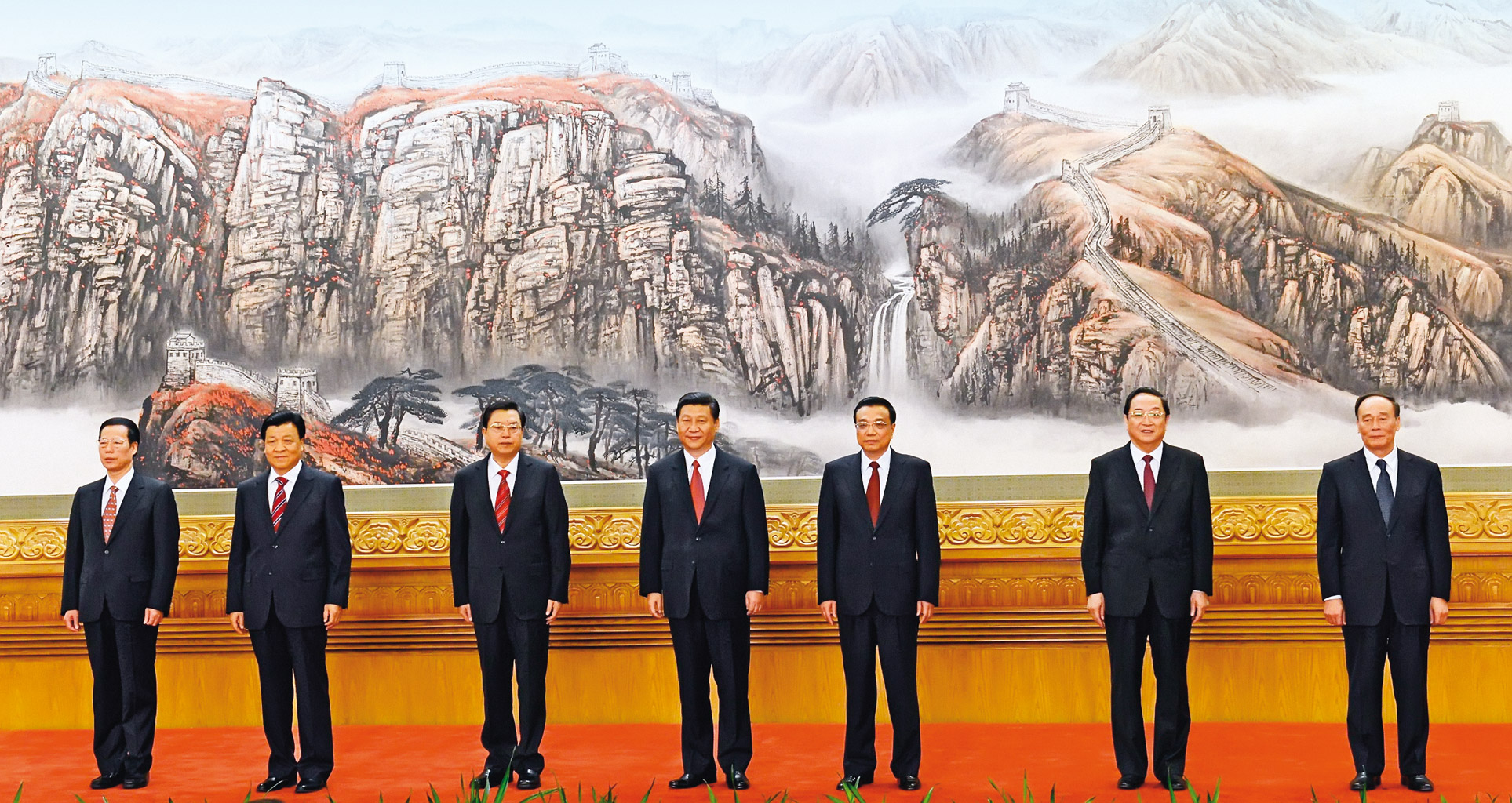 Czerwona siódemka: poznaliśmy nowych przywódców Chin. Najważniejszy jest sekretarz generalny partii komunistycznej Xi Jinping (czyt. Śi Dzinping, na fot. czwarty od lewej), który w marcu zostanie przewodniczącym państwa, oraz Li Keqiang (czyt. Li Keciang, piąty od lewej), przyszły premier. Będą rządzić przez całą dekadę. Mają przypilnować, by kraj rozwijał się w dotychczasowym tempie, a partia zachowała władzę.