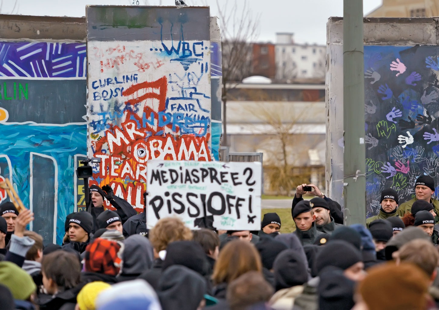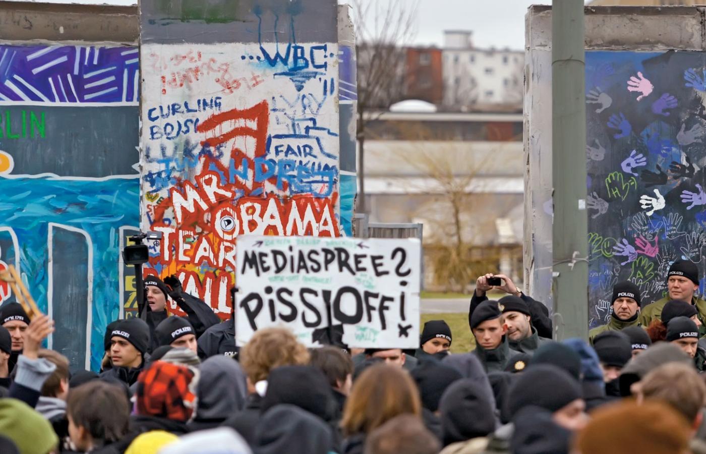 Od kilkunastu dni przeciw wyburzeniu zachowanego fragmentu muru berlińskiego, który jest jednym z najbardziej znanych symboli miasta, protestuje kilkaset osób. Buldożery usunęły już duże fragmenty East Side Gallery, pokrytego politycznymi obrazami światowych artystów, najdłuższego zachowanego fragmentu umocnień granicznych oddzielających wschodnią i zachodnią część Berlina. Między murem a Szprewą ma powstać nowoczesny 14-piętrowy wieżowiec z luksusowymi apartamentami, podziemnym parkingiem i biurami. Działki budowlane nad Szprewą należą do najbardziej pożądanych w stolicy Niemiec. Planuje się tu także budowę hotelu i biurowca. Przeciwnicy zburzenia muru zebrali już 50 tys. podpisów. W niedzielę w tej sprawie protestowało blisko 10 tys. osób. Prace wstrzymano, ale szanse na wygraną są jednak niewielkie. Wykonawca zobowiązał się za to do ustawienia usuniętych fragmentów muru w innym miejscu. W 2008 r. East Side Gallery została odnowiona kosztem 2,2 mln euro.