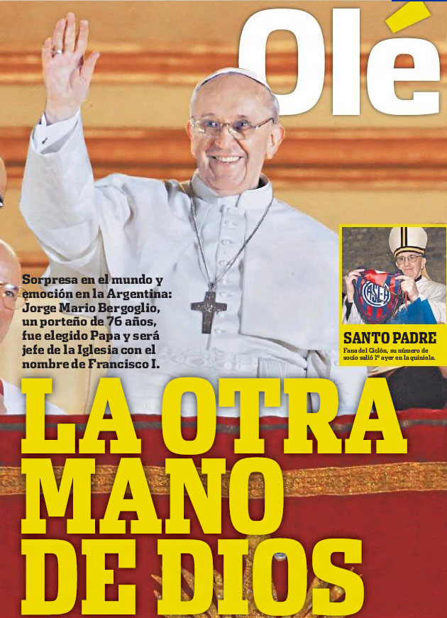 Od piłkarskich skojarzeń nie stroniły też inne gazety. „Druga ręka Boga” - tak wybór Jorge Bergoglio skomentował na pierwszej stronie dziennik „Olé”, nawiązując do „boskiej ręki” Diego Armando Maradony, która dała Argentyńczykom zwycięstwo nad Anglią w pamiętnym meczu meksykańskiego mundialu. Tabloid „Muy” stwierdza zaś krótko: „Papież jest nasz”.
