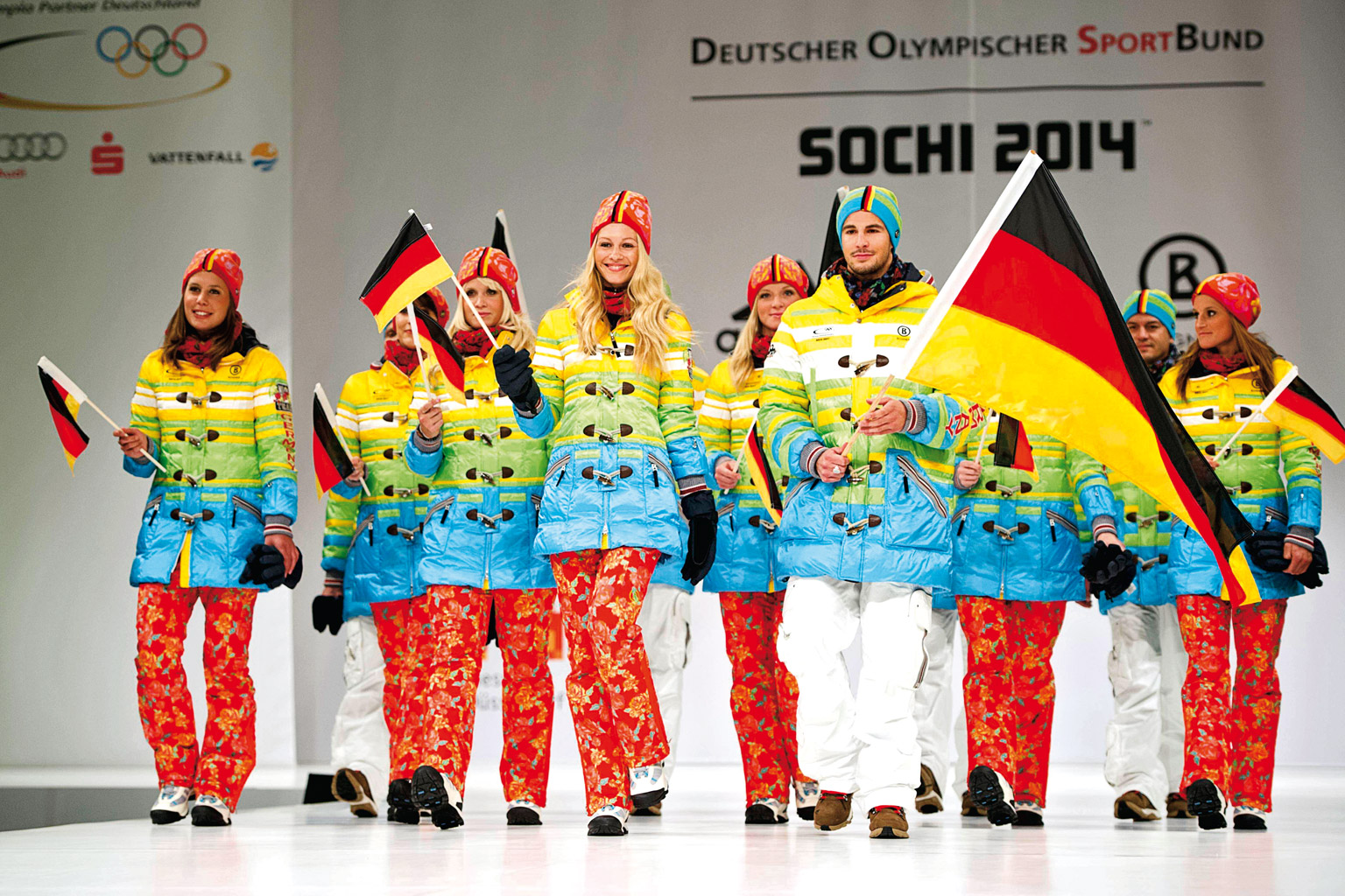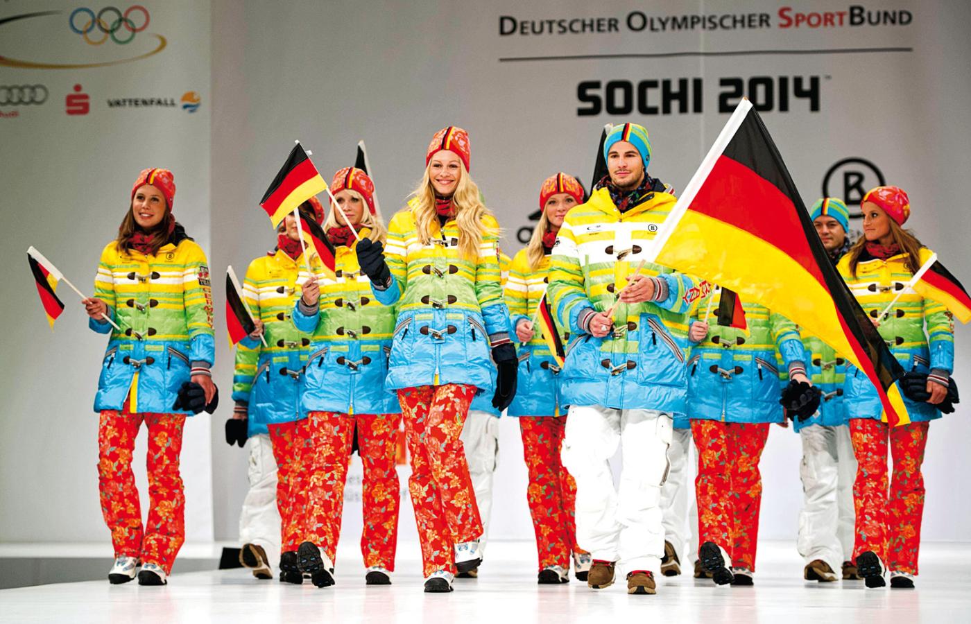 W Düsseldorfie na specjalnym pokazie miały premierę niemieckie stroje olimpijskie na rozpoczynające się 7 lutego zimowe igrzyska w Soczi. Wzbudziły niemałą sensację, bo wielu obserwatorów (i internautów) z miejsca uznało, że ta tęczowa kolekcja projektu Willy’ego Boguera to śmiały protest przeciwko nowej rosyjskiej ustawie antygejowskiej, zabraniającej propagowania „nietradycyjnych zachowań seksualnych”. Ustawa ta, jak wiadomo, odbiła się nieprzychylnym echem w światku olimpijskim i nie tylko, łącznie z wezwaniami do bojkotu Soczi czy przeniesienia igrzysk do Vancouver. Niestety, przedstawiciel Niemieckiej Konfederacji Sportów Olimpijskich (DOSB) ogłosił, że stroje były przygotowywane dużo wcześniej, nim rozeszła się wieść o ustawie, więc nie niosą żadnego ukrytego przesłania. Niestety – bo w kategoriach pozapolitycznych zostały banalnie uznane za „papuzie i wstrętne”.